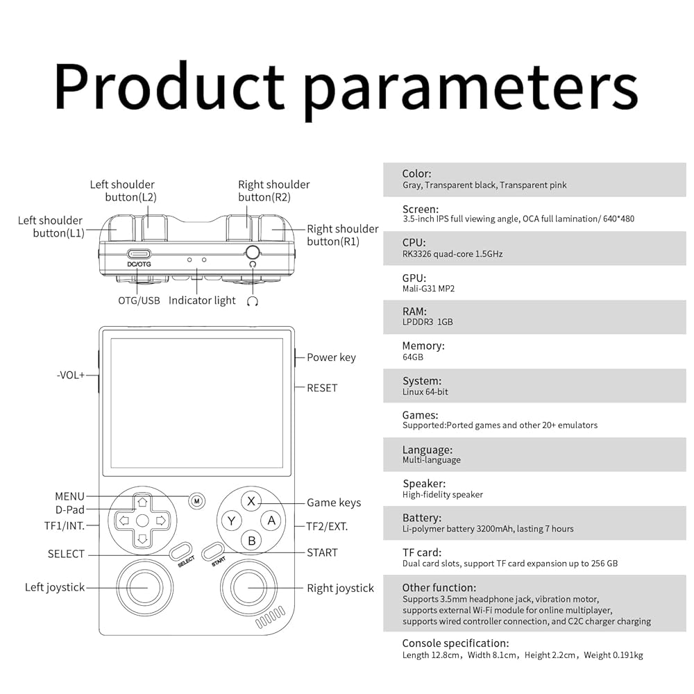 【Upgrade Retro Game System】-The G350 is a high-performance retro video game console, equipped with a 1.5GHz 64-bit RK3326 CPU and a Mali-G31MP dual-core GPU. The retro gaming console supports external Wi-Fi module for online multiplayer, supports wired controller connection, and C2C charger charging.