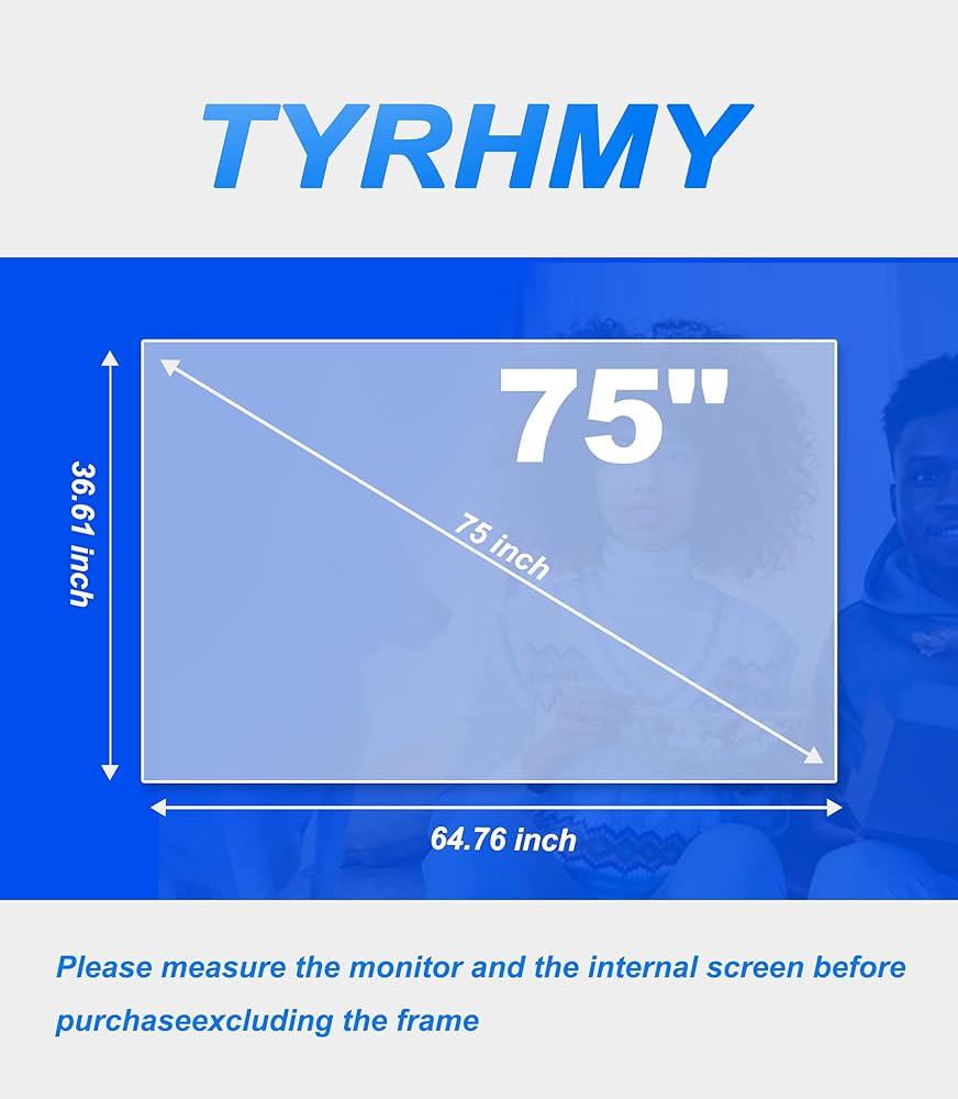 Important: The actual size of the protective film is 75 inches W64.76in*H36.61in, please compare your TV's internal screen with our size chart, the screen protector needs to match the screen or slightly smaller than the screen Does not apply to all brands of 75 inch screen If your screen is much larger than the protective film is also not fit