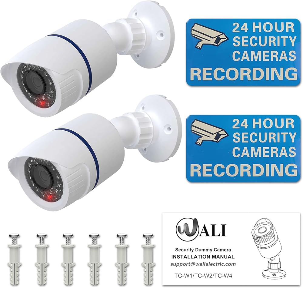 WALI Dummy Fake Camera, Surveillance Security CCTV Dome Camera, Indoor Outdoor Cameras, with One LED Light, Security Alert Sticker Decals (TC-W2), 2 Pack, White
