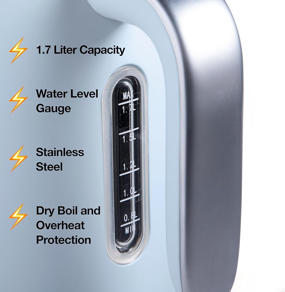 Safe and Simple to Use - Our kettle is designed with auto shut off feature and boil - dry protection for your safety. If you forget that you turned on the kettle or accidently turned it on with no water it will automatically shut off. Base features cord compartment for neat storage.
