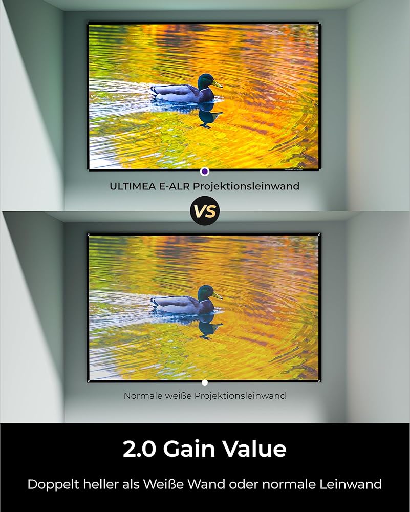 2.0 Gain Value Projector Screen: ALR screens reflect more projected light back to eyes to produce a brighter and more contrast-rich image. The 2.0 gain value signifies the screen's brightness is twice that of a white screen or white wall for the same projector. Silver screens effectively double the performance of projectors, delivering extraordinary viewing experience.