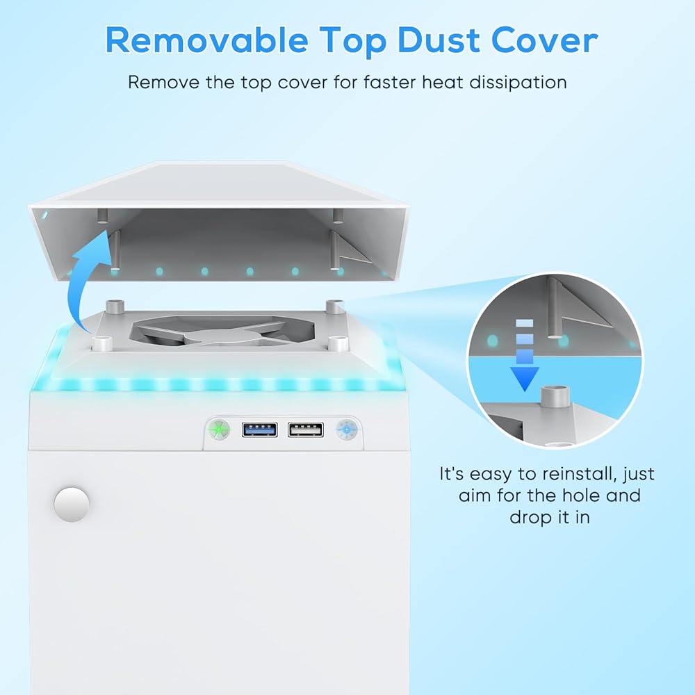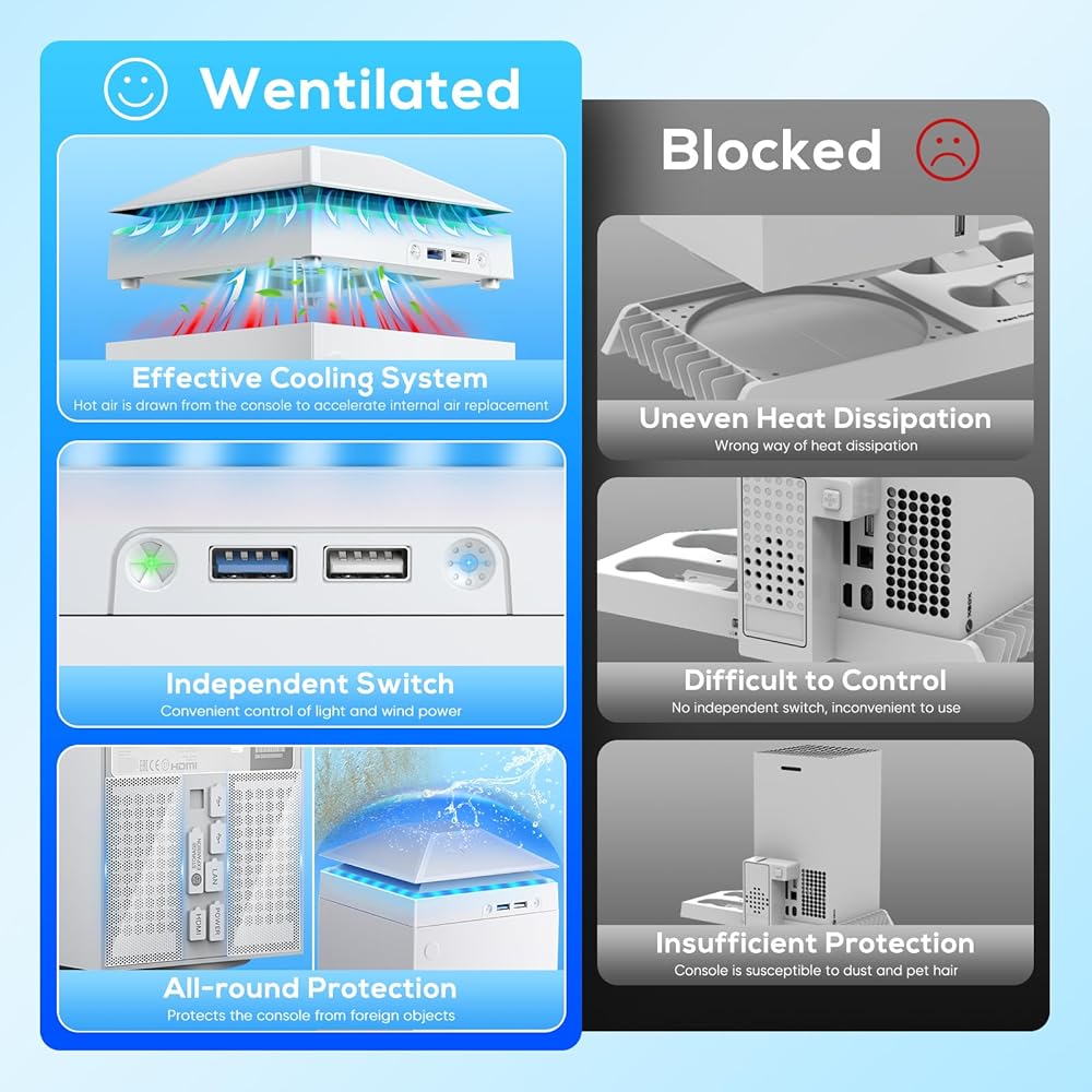 【Dust Cover Design】When the top dust cover is opened, the cooling fan for xbox series x ventilation effect can be enhanced and the cooling speed of the console can be accelerated. The fan allows your console to be placed horizontally or vertically according to your needs. Top fan and side dust filter as well as host port dust plugs can effectively prevent the ingress of dust, moisture and tiny particles. Easy to use and install, multiple protection of the performance of your X-Series X console.
