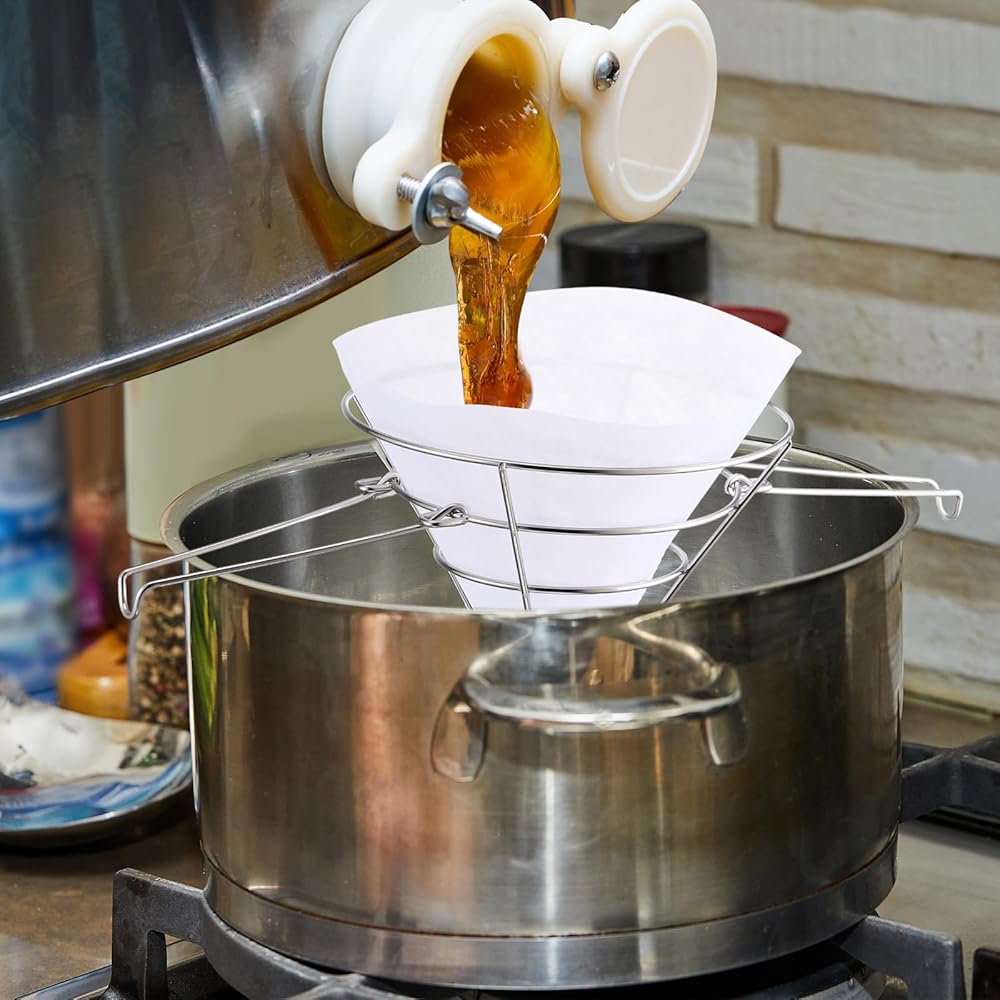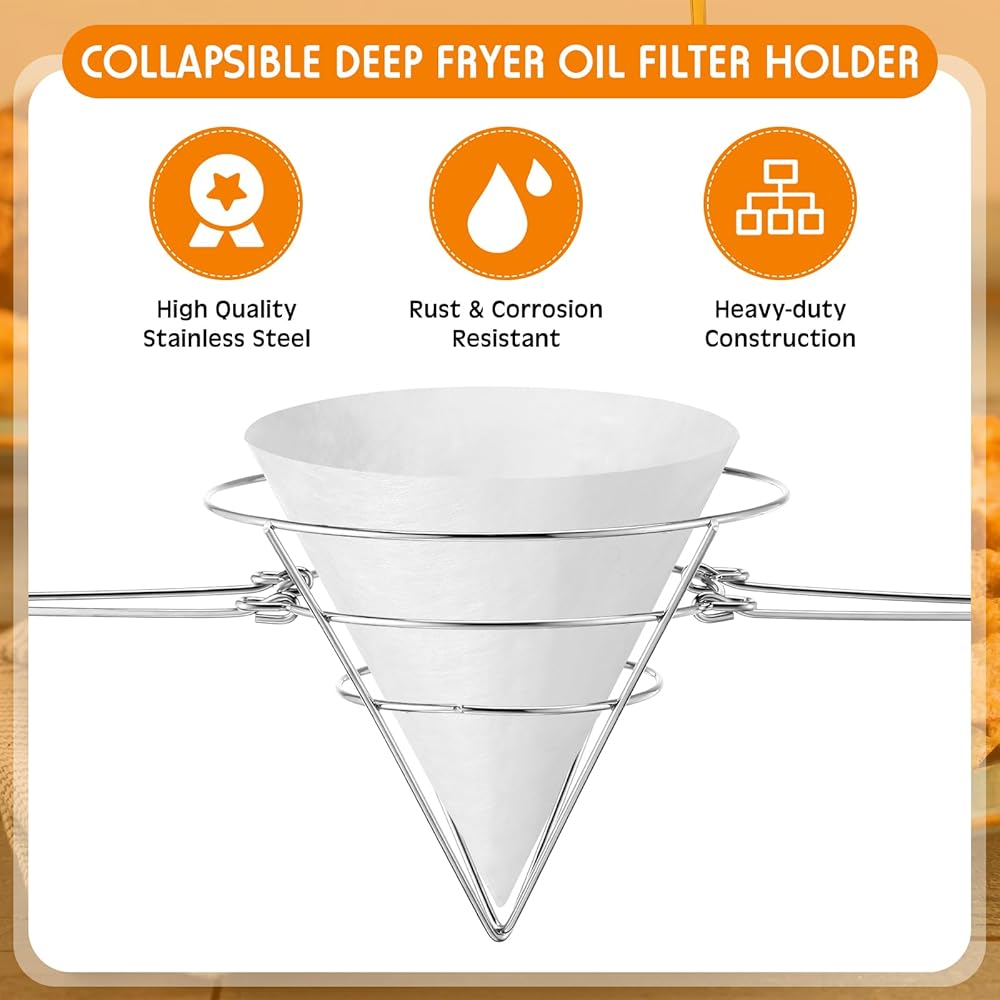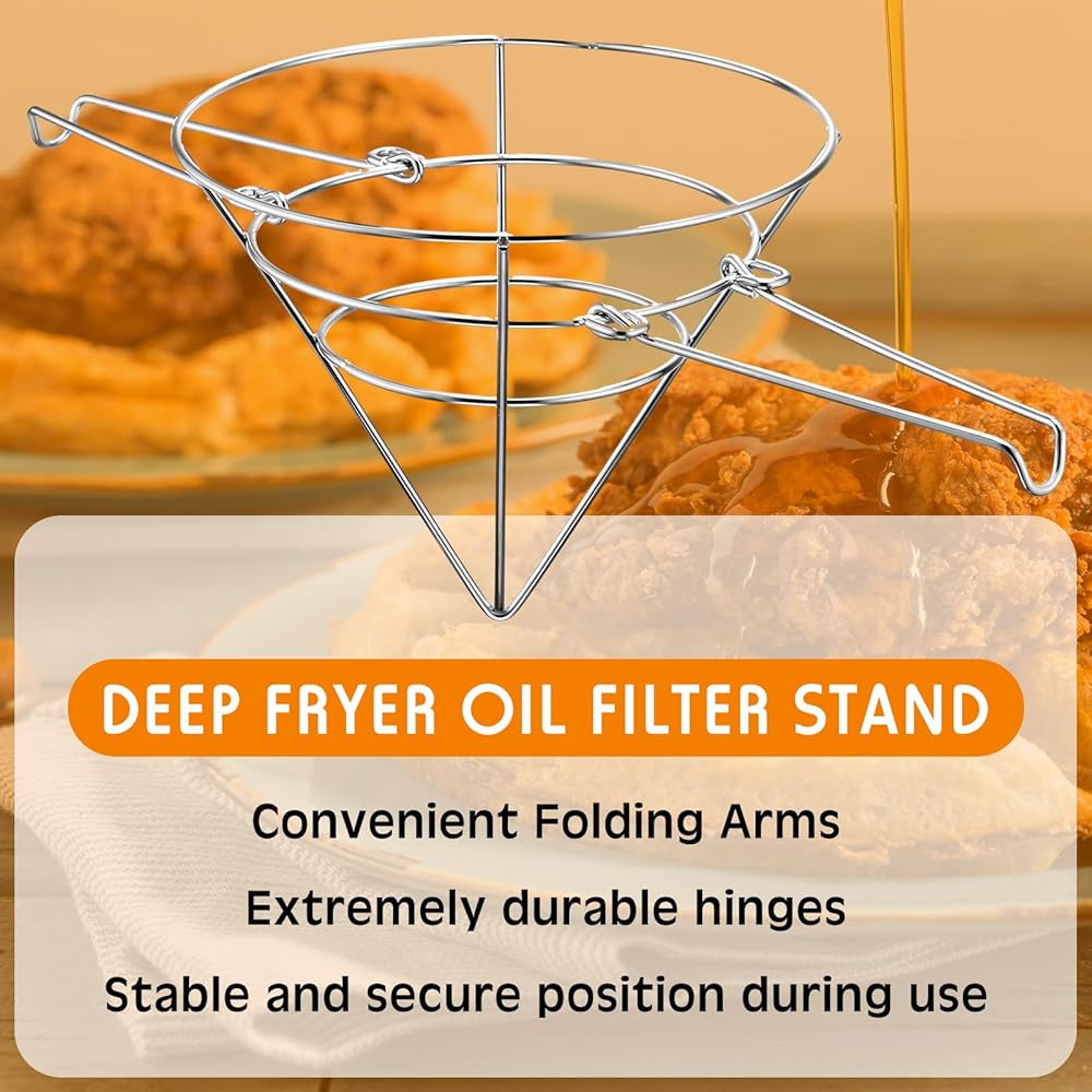 The deep fryer oil filter stand is user friendly, easily supporting the cone filters. Its design simplifies the process of filtering your cooking oil, allowing you to continue preparing other parts of your meal while the oil filters.