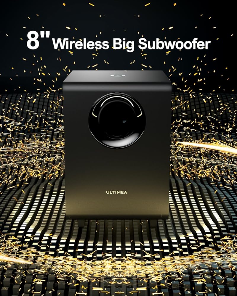 8" Wireless Jumbo Subwoofer: Featuring a cutting-edge magnetic circuit system and a 25L cabinet, the advanced subwoofer achieves a diaphragm amplitude of 18mm for deep, powerful bass. Enhanced by ULTIMEA's BassMX technology, the subwoofer ensures low-frequency sounds resonate with impact, delivering thunderous and dynamic bass performance.