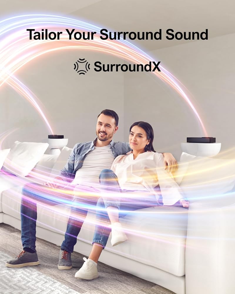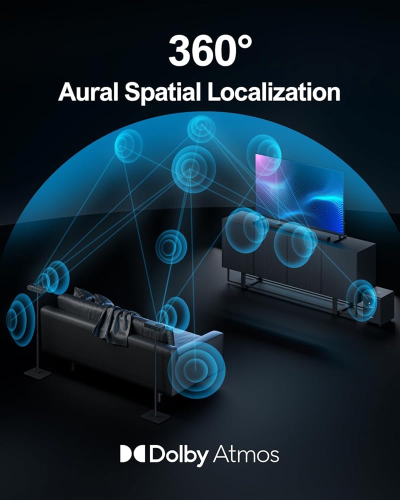 4 Up-firing Drivers for Overhead Immersion: Nova S90's 4 up-firing drivers are engineered to reflect and distribute sound evenly, creating accurate spatial positioning and rendering. With upgraded wireless rear surround speakers that can be placed flexibly, the soundbar delivers layered and multidirectional audio, enveloping you in a rich, immersive soundscape.