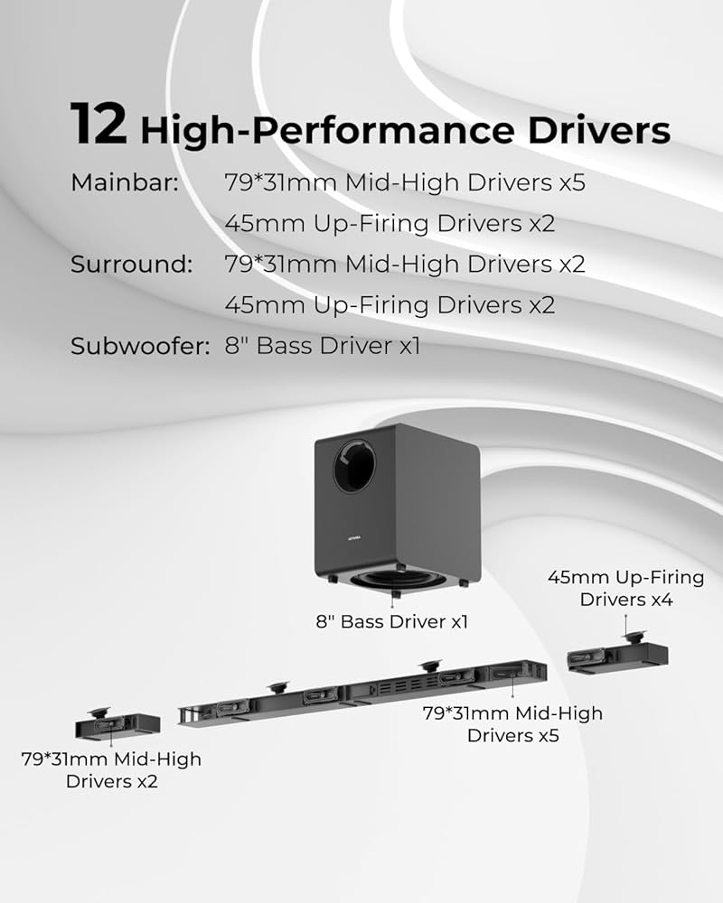 True High-End Wireless 7.1.4 Surround Sound System: The Nova S90 soundbar is equipped with 12 advanced drivers, including 5 full-range units, 2 side-firing speakers, a dedicated 8-inch subwoofer, and 4 up-firing drivers, delivering up to 740W peak power. Designed to create a Dolby Atmos cinematic experience, it transforms your living room with stunning spatial audio immersion. (Note: Nova S90 does not support DTS decoding.)