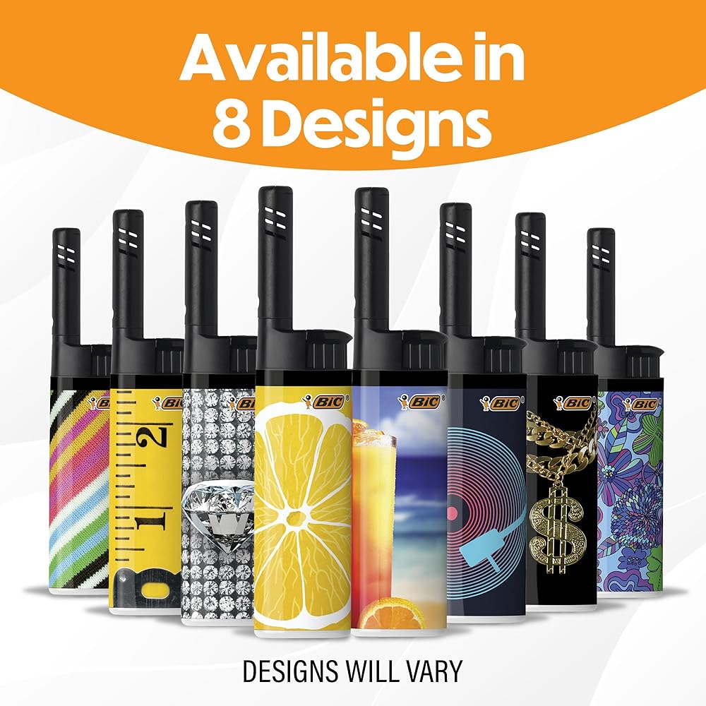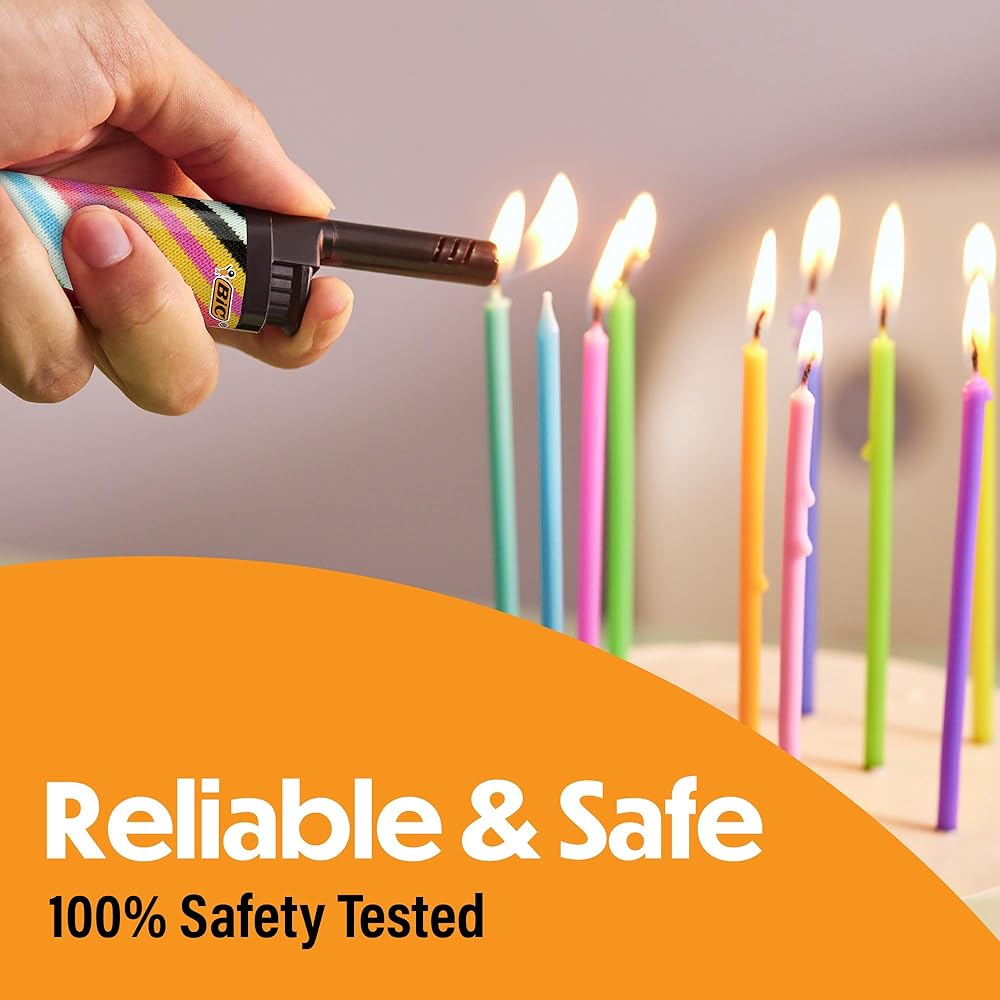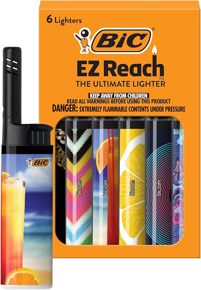 Whether you need a candle lighter for a special occasion, an extended wand lighter for your grill or a long wand lighter for your firepit, BIC EZ Reach is there to light the way. The BIC EZ Reach Lighter helps keep fingers away from the flame and is the essential tool for safe and convenient indoor and outdoor lighting needs. Our high-performing, long-lasting lighters for grills feature a durable 1.45-inch wand to help keep hands away from fire, have a child-resistant mechanism, and are 100% quality inspected. Pack of 6 BIC EZ Reach Lighters in assorted Favorites Series designs for candles, grills and more BIC EZ Reach Long Lighter is great for a variety of lighting needs, including candles, grills, firepits, barbecues and more. Makes a great candle lighter with it's 1.45-inch extended wand that helps keep fingers further from the flame. Up to 50% More Lights vs. non-refillable pocket extended wand lighters. Child-resistant, safe, and reliable Bic grill lighters, 100% safety tested
