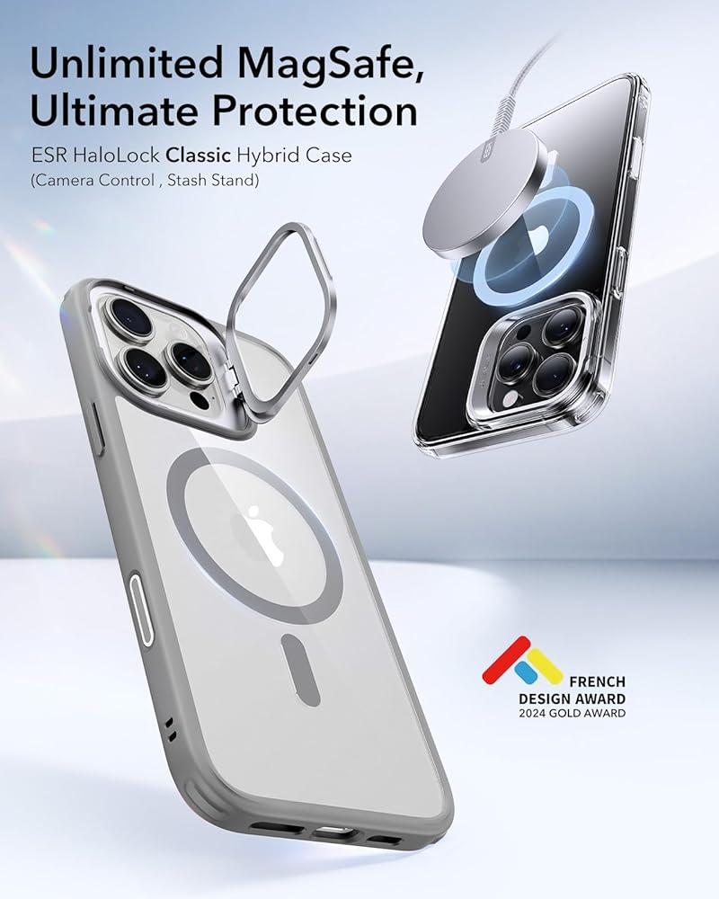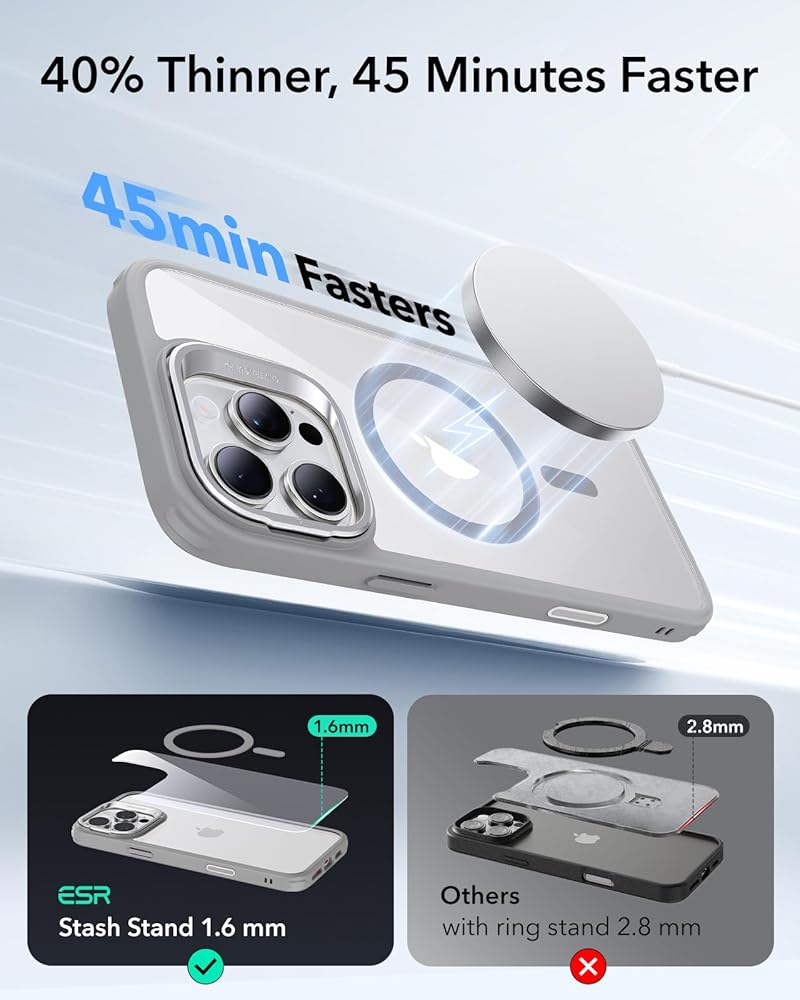 Adjustable Stash Stand: positioned around camera frame to stay hidden when folded away while keeping MagSafe ring 100% unobstructed; enjoy a freely adjustable and stable view for watching shows whenever, wherever