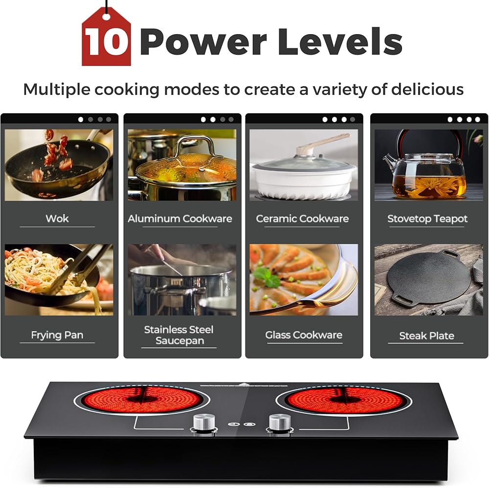 ADVWIN Electric Cooktop, 2 Burner Knob Control Plug in Built-in Ceramic Electric Stove Top with Child Safty Lock & Timer & Over-Temperature Protection & 10 Power Setting, 1800W, 110v (2 burners)