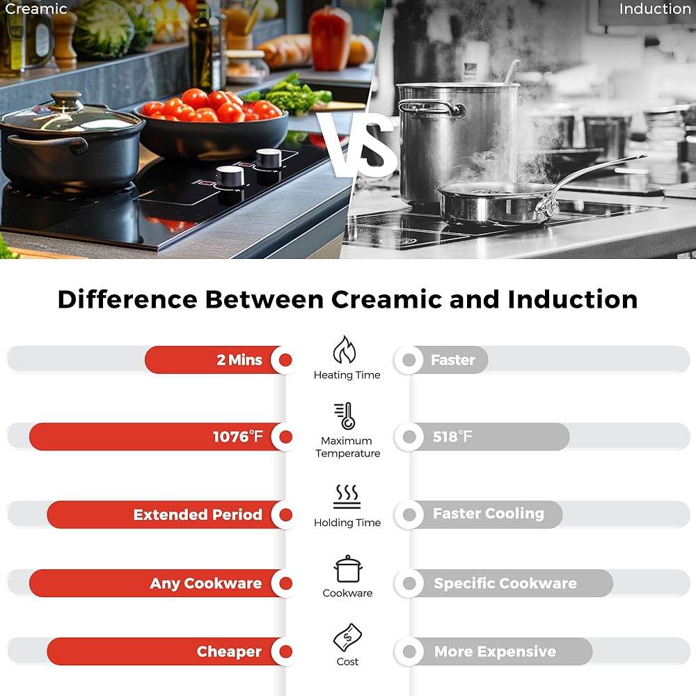 【Safe and Easy-to-Use 】Each burner has an independent operating area, making the 2-burner electric cooktop simple for anyone to use. Multiple safety features include a child safety lock, 99-minute timer, automatic shutdown, residual heat warning, and pause function, ensuring peace of mind for all users, including pregnant women.