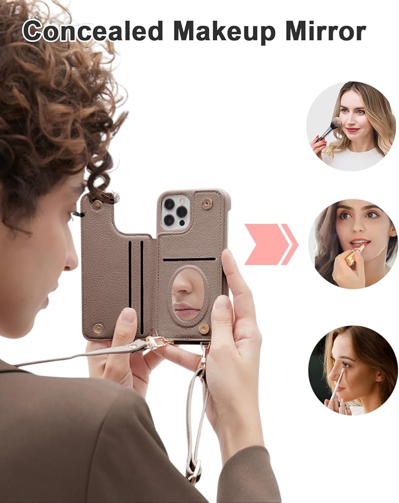 Crossbody Wallet with Cosmetic Mirror Case for iPhone 15, UP Leather Case with Card Slots Invisible Stand, Women Detachable Lanyard 6.1-Inch Phone Case Brown