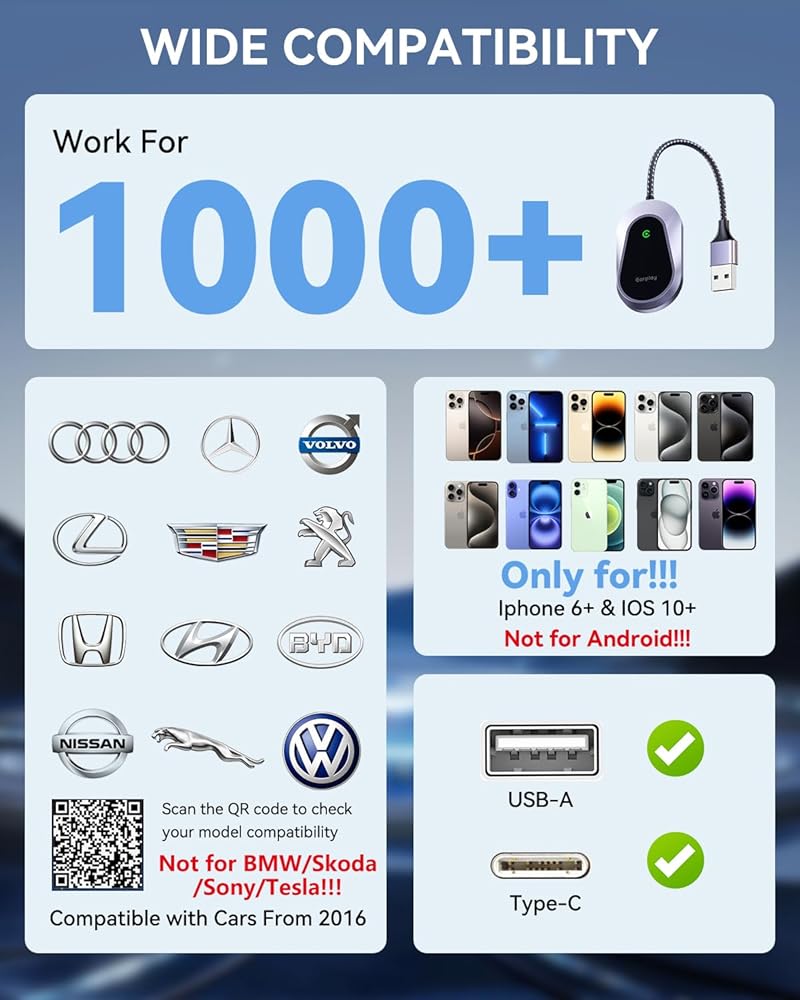 Wide Compatibility: This wireless carplay adapter is compatible with over 1000 car models, including major car brands. It only works with cars equipped with a wired carplay from 2016 onwards. (Please note: Currently not compatible with BMW wired carplay cars.) It only supports iPhone 6 and later devices running iOS 10 system or later (not applicable for Android phones), no more worrying about compatibility, just pure wireless driving fun