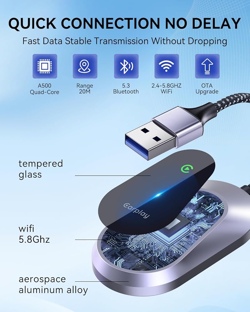 Stable Connection and Fast Transmission: Wireless carplay adapter features 5.8 GHZ WiFi, 5.3 Bluetooth, and a 4-core processor, with adaptive frequency hopping technology, transmission rate is increased by 50%, experience 10 times faster access to maps, media, and other apps on your car display, the unique A500 chip ensures excellent performance in anti-oxidation, corrosion, and temperature tests (-20°C to 70°C), preventing disconnection during long drives for a faster, more reliable carplay experience