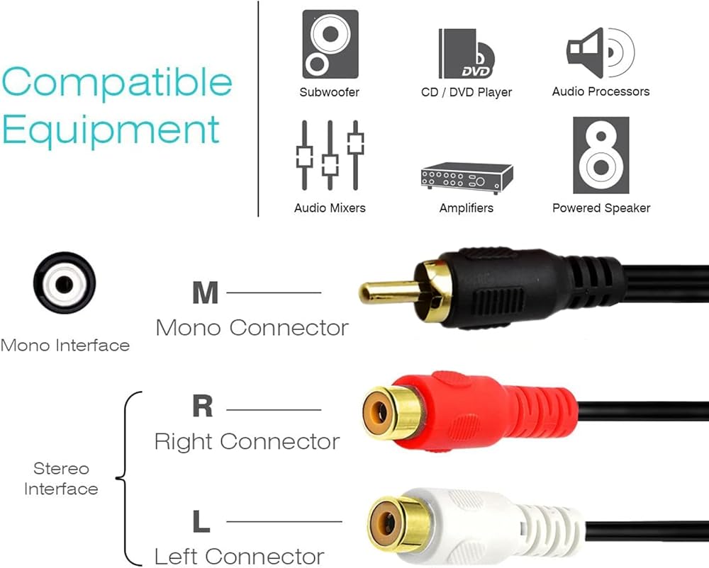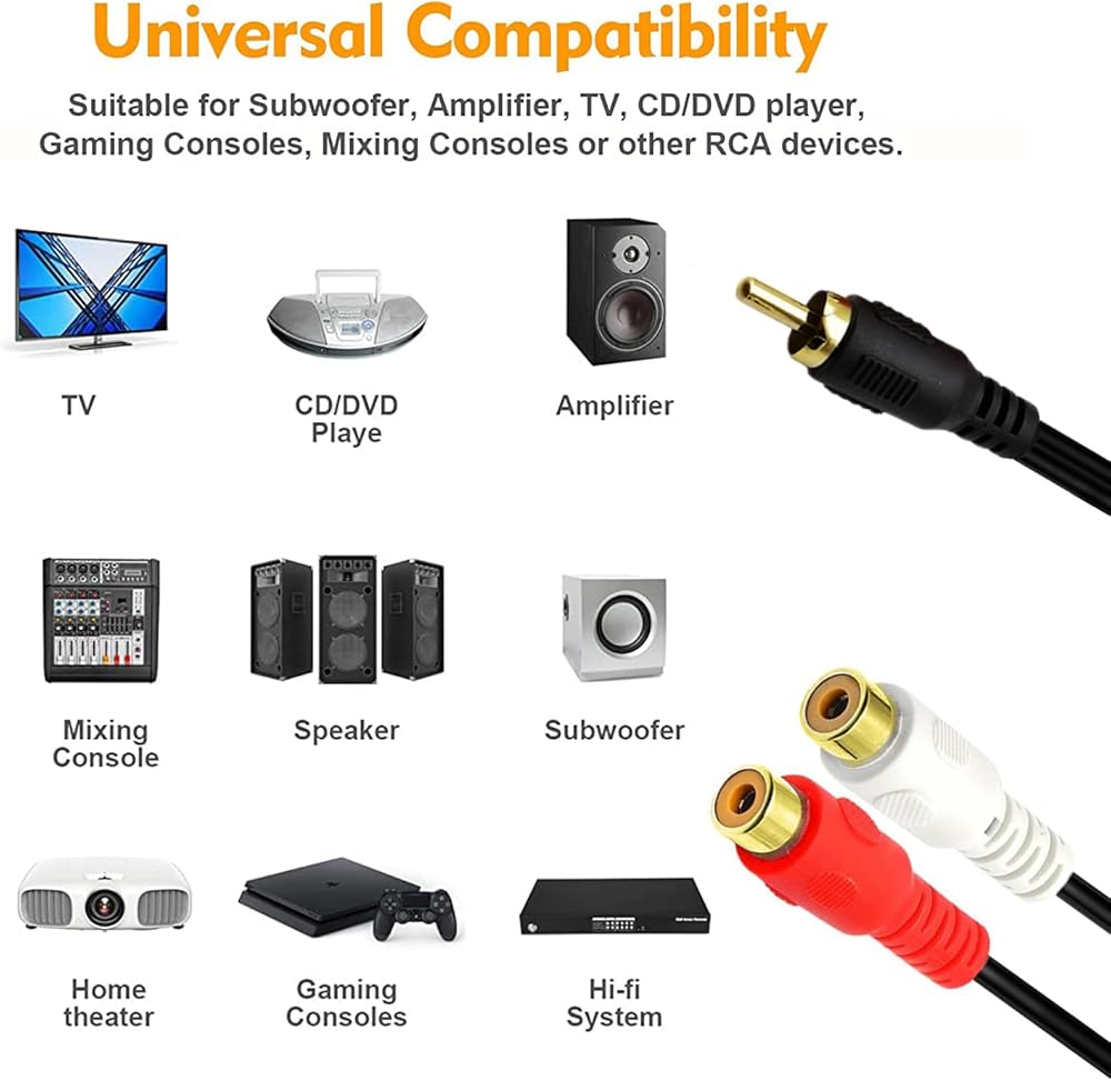 Contents: 2 x RCA female to RCA male audio cable. Cable Length:5ft/1.5m.