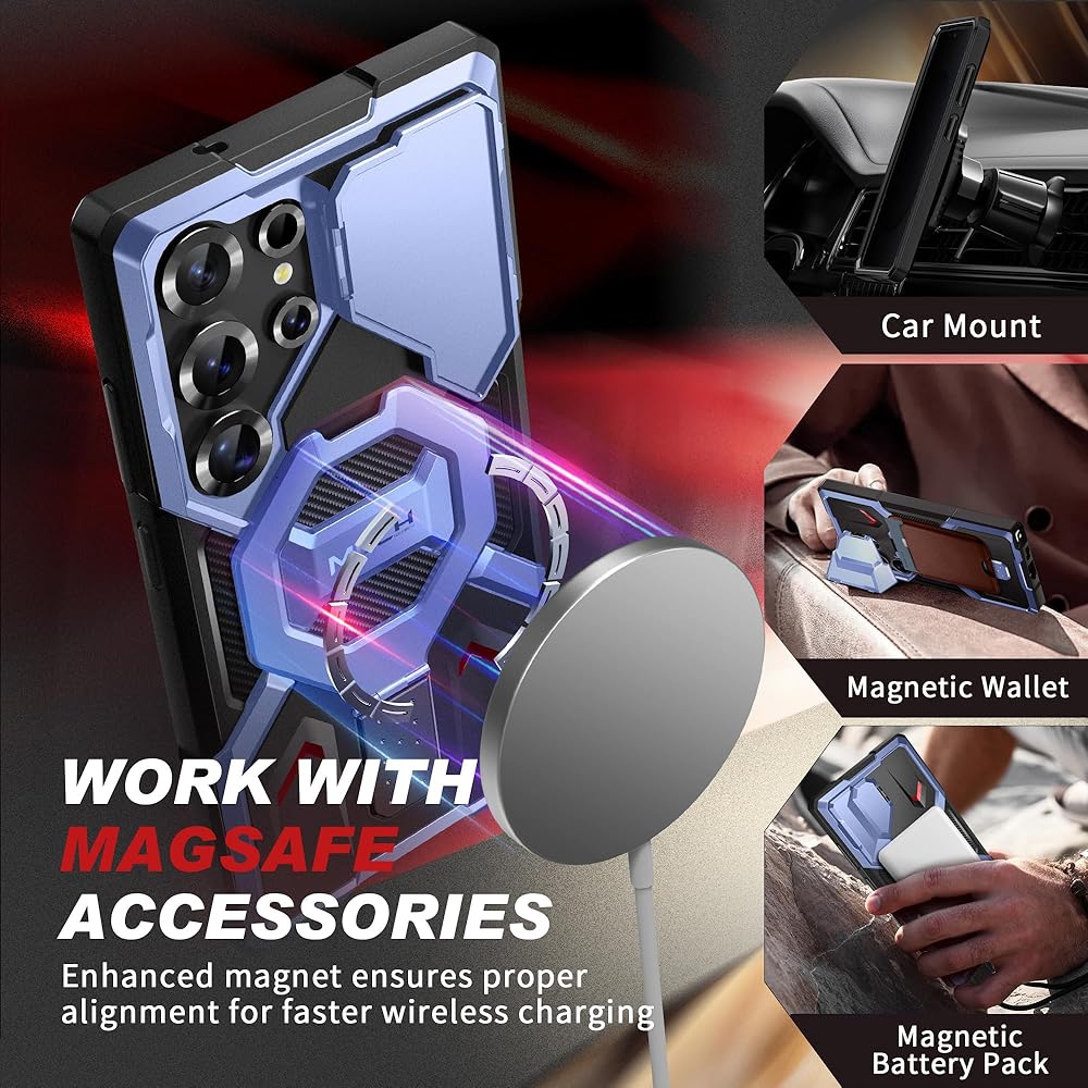 [Magnetic Ring Stand Compatible with Magsafe] The S25 Ultra case has a built-in foldable ring kickstand that allows you to watch videos and movies in portrait or landscape orientation with ease. With N52SH strong magnetic ring inside the ring, it can be securely attached to magnetic wireless chargers, card holders, car phone mounts, etc., so you can enjoy using magnetic accessories!