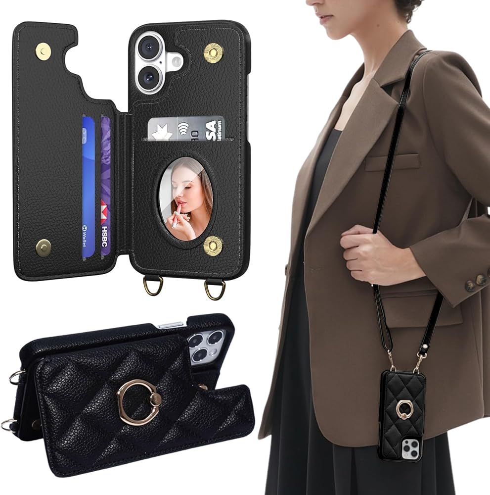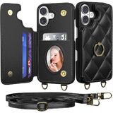 Crossbody Wallet with Cosmetic Mirror Case for iPhone 16, UP Leather Case with Card Slots Invisible Stand, Women Detachable Lanyard 6.1-Inch Phone Case Balck Black