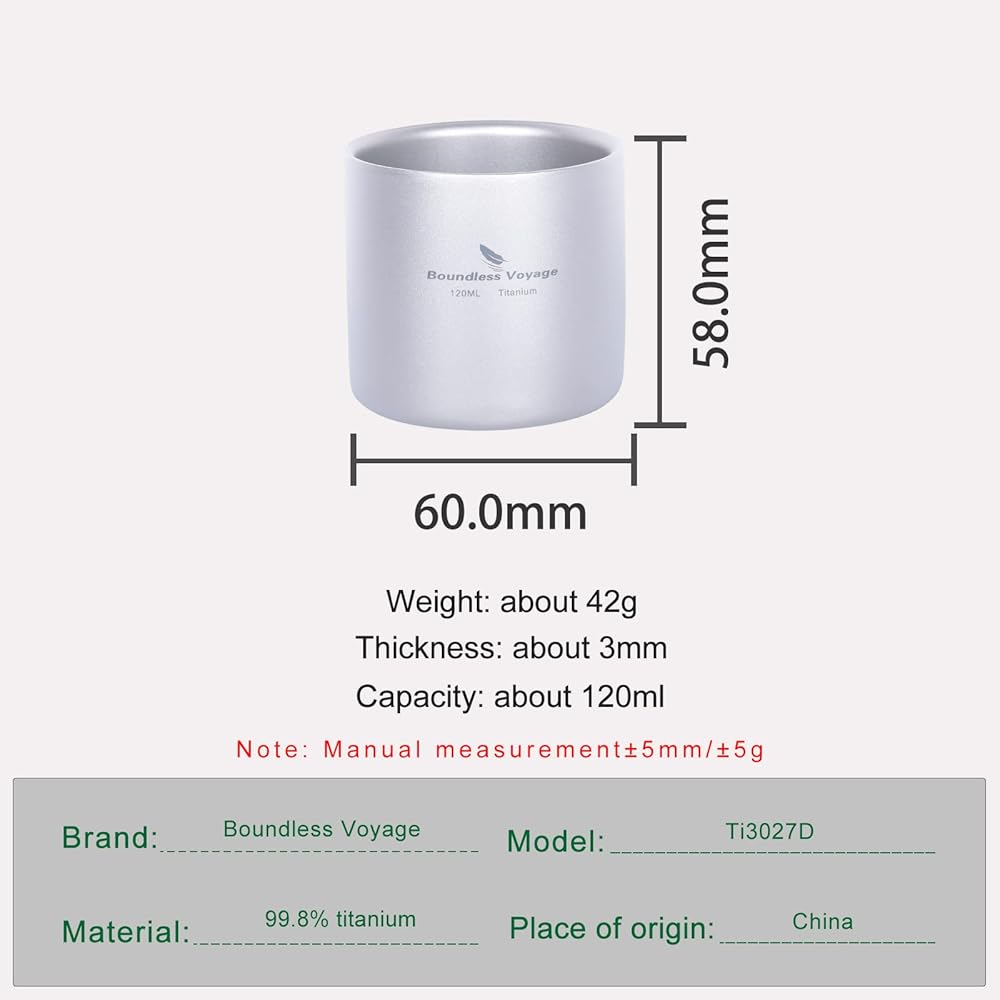 LIGHTWEIGHT & STACKABLE: 120ml: (D) 60mm* (H) 58mm, about 42g. 180ml: (D) 69mm* (H) 67mm, about 56g. 300ml: (D) 76mm* (H) 87mm, about 81g. 450ml: (D) 88mm* (H) 95mm, about 104g. model no. Ti3031D is a set of 3 in 1 120ml 180ml 300ml combo mug set, Model No. Ti3028930D is a set of 3 in 1 180ml 300ml 450ml combo mug set.