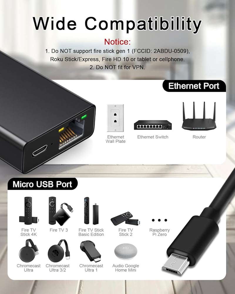 Pre-Use Instructions - Suitable for Fire Stick TV 4k, Google Home Mini, chromecast ultra audio, etc.NOT compatible with Fire TV stick gen 1, Chromecast with Google TV(HD)/Chromecast with Google TV(4K), roku stick/express, fire HD 10 or tablet or cellphone; Does not fit for VPN.