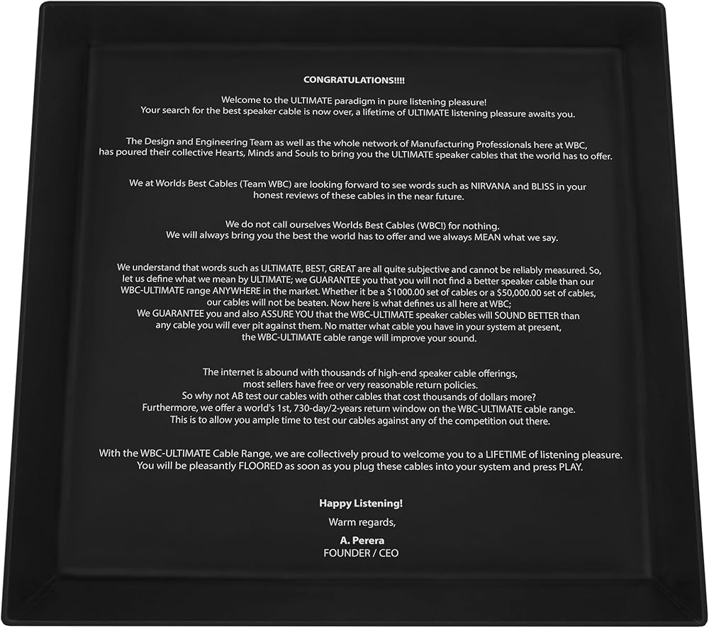 With the “WBC – Ultimate Assembly Range” of cables, you will experience the best WBC has to offer whilst enjoying the aesthetically pleasing looks these luxury assemblies will bring into your system. The high-end packaging, makes these a great gift for any Audiophile or Music Lover who will appreciate handcrafted, high quality audio cabling. The braided Tweed cloth jacket and embroidered labeling will compliment your high-end gear quite tastefully; this is truly “The Ultimate” speaker cable.