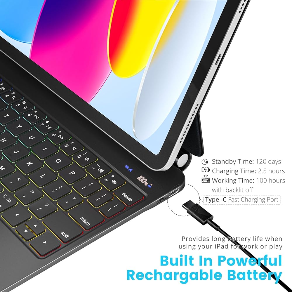 【Long Lasting Battery】 The battery for ipad 10th generation case is ultra-efficient design let you work longer on a single charge. The keyboard charges the battery very quickly via USB-C. With LED display that shows remaining battery percentage.