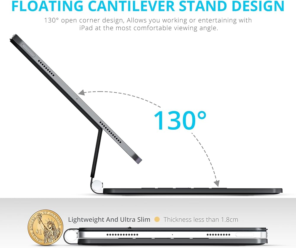 【135°Adjustable Floating Magnetic Stand】Angle adjustable up to 135 degrees,whether you are in the office, school, or cafe, Set the floating cantilever stand find your perfect viewing angle, and transform your iPad into a highly performant and easy-to-use laptop within a second. Which is perfect for traveling, business, and school.