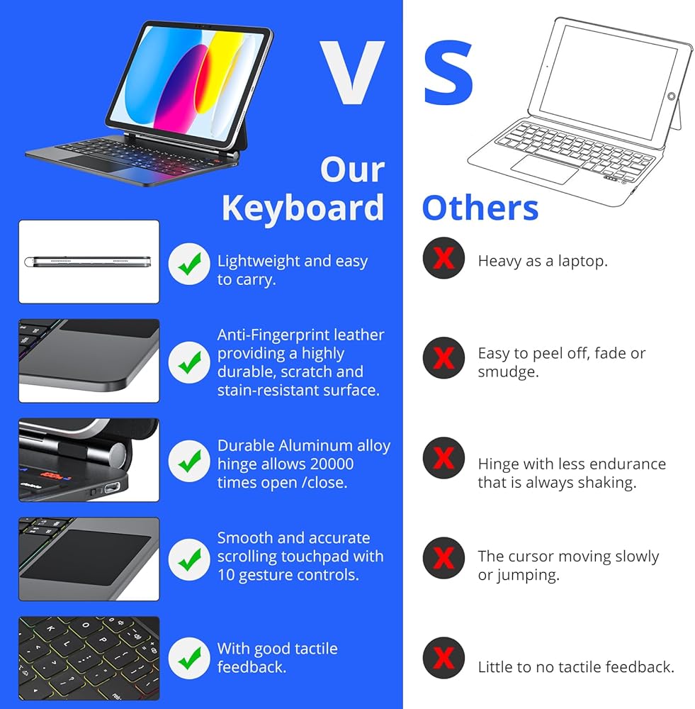 【7 Colors Backlight & 3 Modes Adjust Backlit】The keyboard for ipad 10th generation with multi-touch trackpad and 7-color backlit provide a comfortable and efficient typing experience.With 3 adjustable brightness levels, making typing smooth and efficient, protect your eyesight.