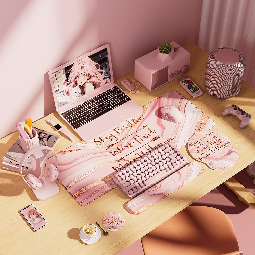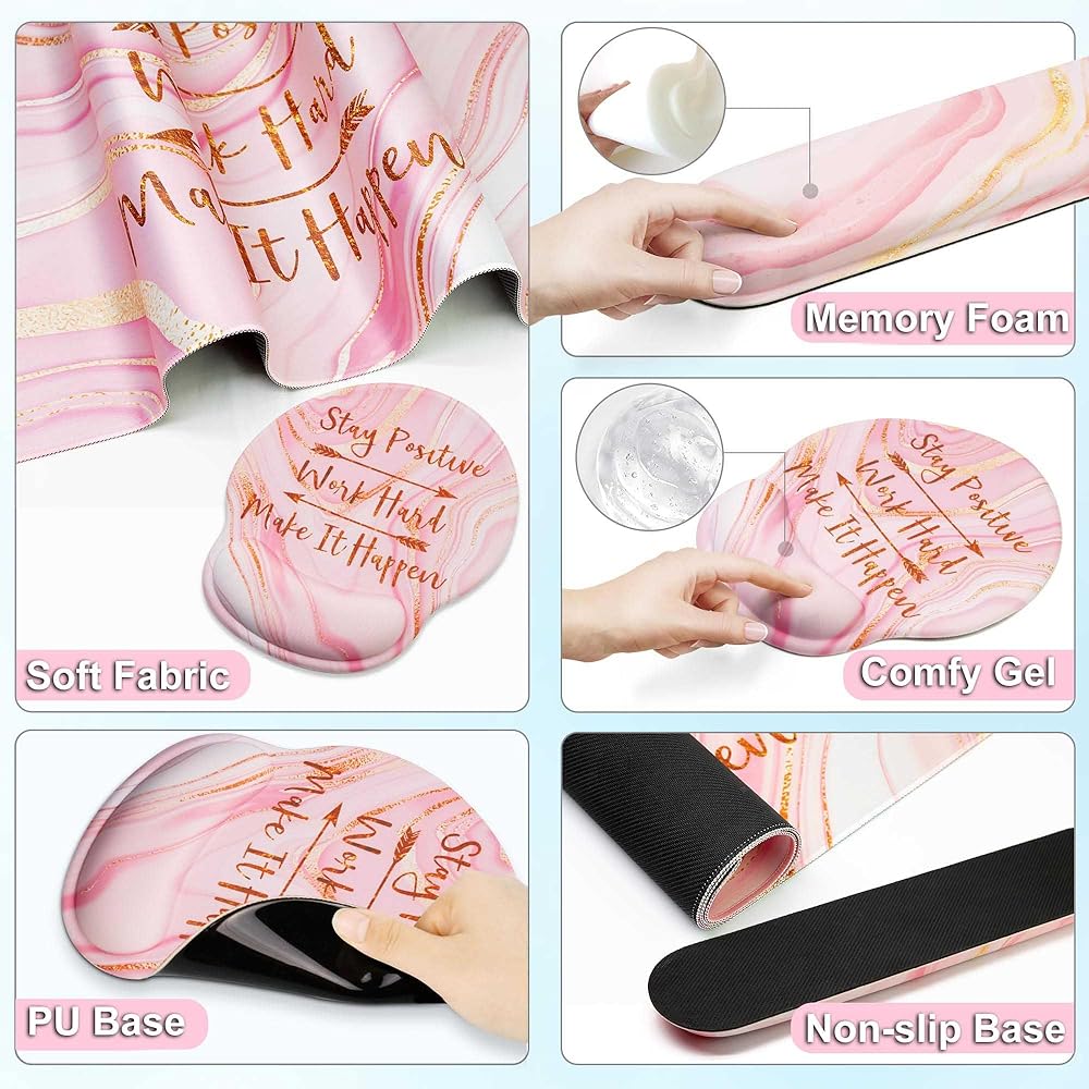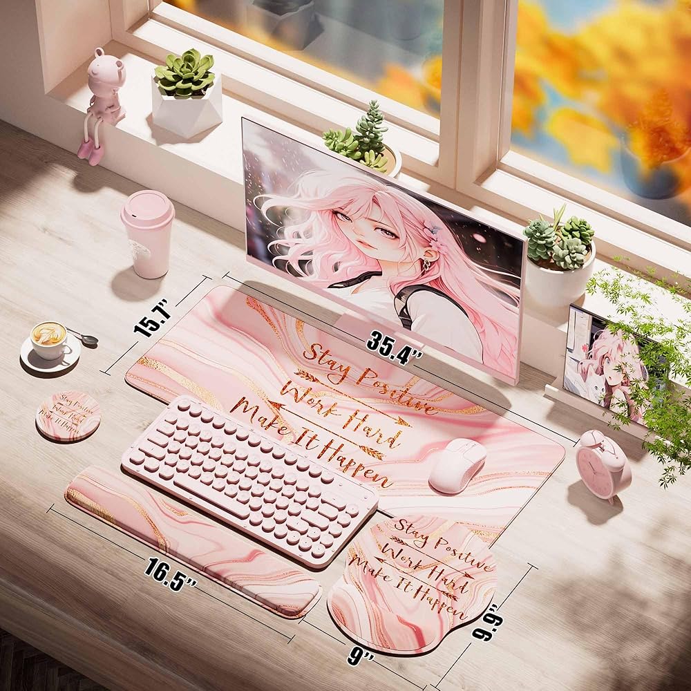 Pink Slogan Design: The mousepad and deskmat set is designed with pink rose gold background,with stay positive work hard make it happen slogan, aesthetic patterns can increase energy and add some personality when you working or studying and make your desktop special and cool,it is also a good office & home desk decor.