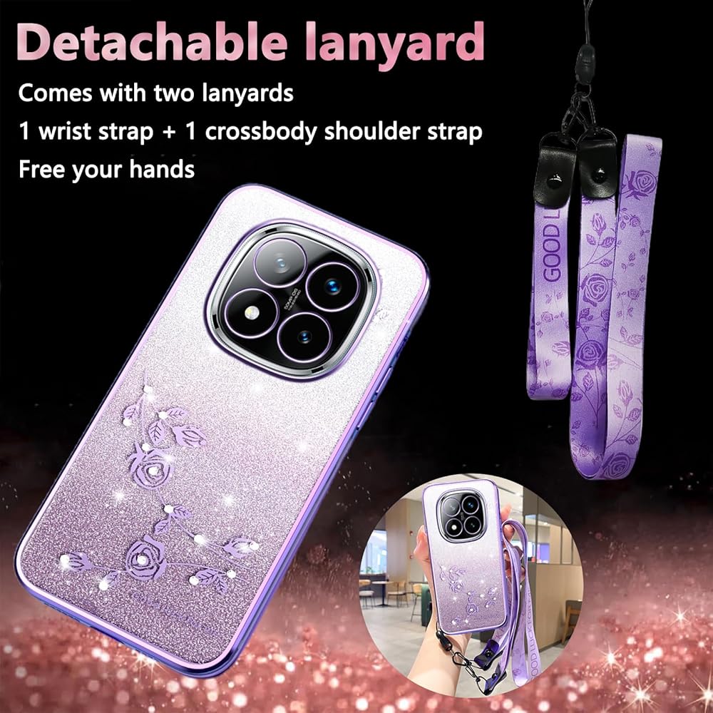 for Xiaomi Redmi Note 14 Pro+ Plus 5G Case Glitter with Crossbody Lanyard Strap for Women Girls, Sparkle Bling Shiny Girly Cover Cute Flowers Floral Case for Redmi Note 14 Pro Plus YSS Purple