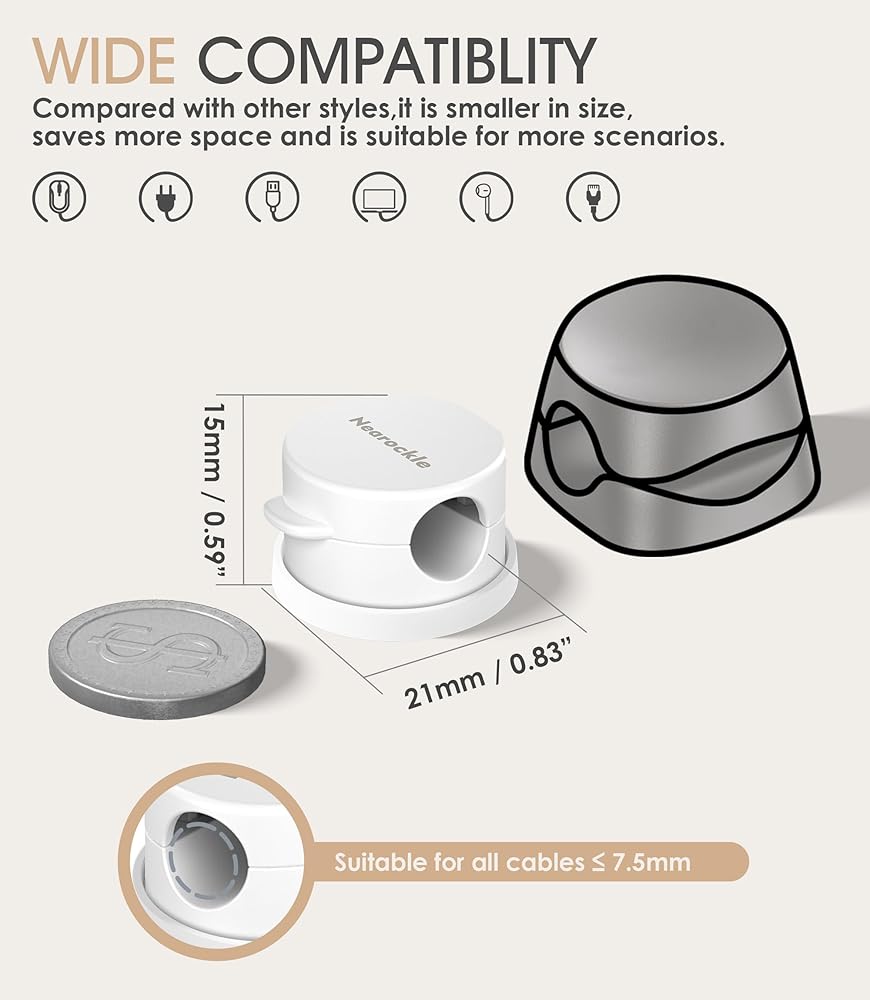 【7.5 mm Perfect Cable Slot Diameter】The 0.3inch (7.5mm) diameter can hold most cables, such as mobile phone charging cables, USB cables, HDMI thick cables, computer power cables, etc. Moreover, it can ensure that the charging cable as small as the iPhone original charging cable is fixed and does not fall off, pulled out smoothly
