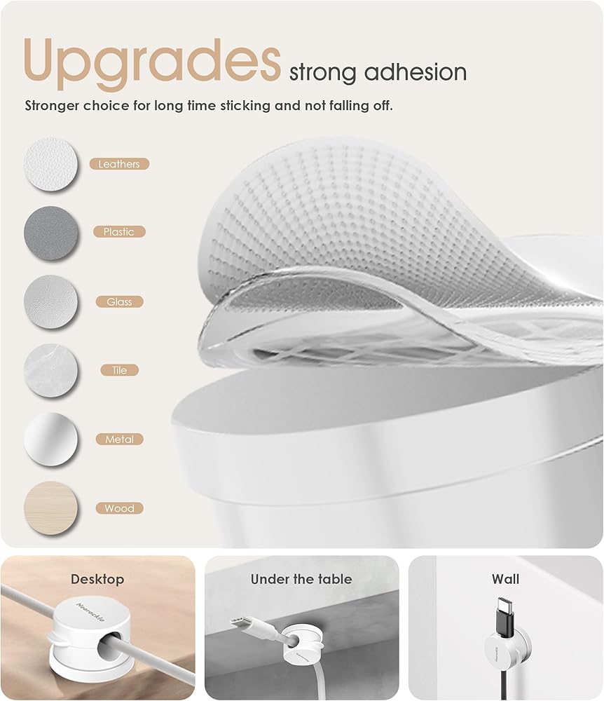 【No-Residue Acrylic Adhesive】Using upgraded acrylic adhesive, it is stronger and will not leave any residue when peeled off. Simply stick the cable organizer to any smooth, dry surface such as a wooden table, glass or tile, etc. the transparent adhesive pads won't damage your table, nightstand or walls. [Warm Tips: Please clean the desired surface without dust before sticking, and keep pressing for 30 seconds to enhance the adhesion of the sticky pad. Highly recommend waiting for 1 hours for better use]