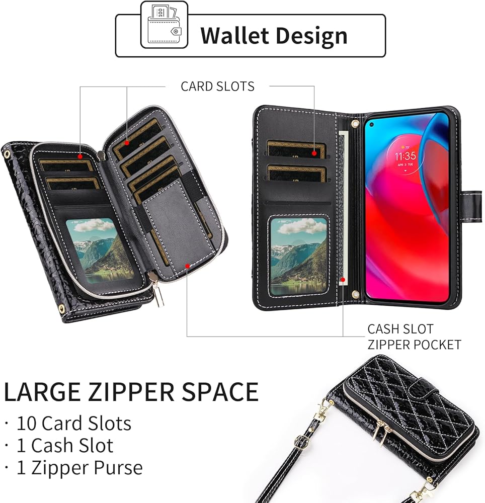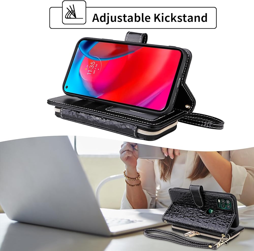 Argyle Wallet Case for Moto G Stylus 5G 2021 with Crossbody/Wrist Strap Luxury PU Leather Kickstand Zipper Purse Shockproof Card Holder Cell Phone Cover for Motorola GStylus G5 XT2131DL Black