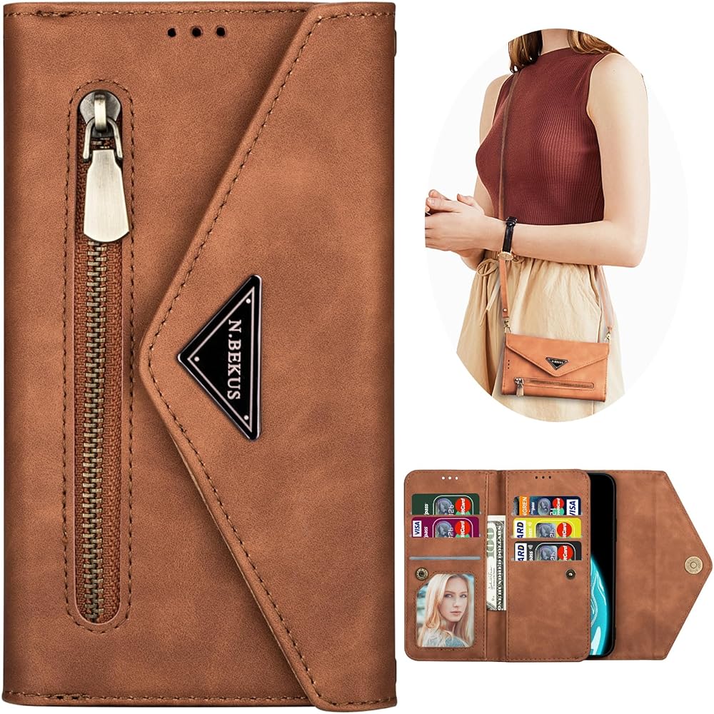 CCSamll Crossbody Wallet Case for Samsung Galaxy S24 FE (Not S24) for Women, Zipper Pocket Purse Handbag Neck Strap Lanyard Cover with 9 Card Slot Holder Case for Samsung S24 FE XK Brown