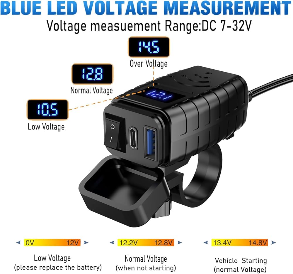 This product is a multifunctional waterproof USB charger designed for motorcycle riding enthusiasts. It integrates a motorcycle mobile phone charger, dual USB C-type PD (Power Delivery) fast charging, and a motorcycle USB charger with Quick Charge 3.0 technology. It is equipped with an intuitive voltmeter that can display the current charging voltage in real time, ensuring that you can always keep track of the charging status. The specially set on/off switch allows you to freely control the power of the charger as needed, which is convenient and energy-saving. This charger is designed for smart devices such as mobile phones, tablets, GPS navigators, etc., and is compatible with most brands of electronic devices on the market to meet your diverse charging needs. Its waterproof design allows you to use it with confidence during riding in wind and rain, without worrying about rain damage to the charger, ensuring that your device is always fully charged, making your journey smoother and worry-free. Using advanced dual USB C-type PD fast charging interfaces, this charger can provide high-speed charging services for two devices at the same time, greatly improving charging efficiency. In addition, Quick Charge 3.0 technology also allows your device to be fully charged in a shorter time, whether it is a long trip or a short trip, it can provide long-lasting and stable power support for your electronic devices. In short, this motorcycle USB charger, which combines practicality, convenience and waterproof performance, is one of the indispensable accessories for your motorcycle riding.