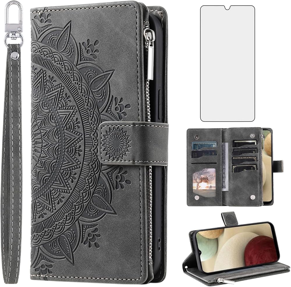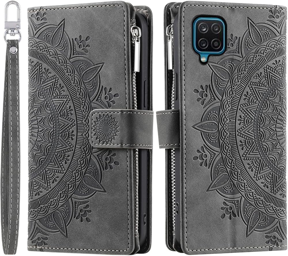 Asuwish Phone Case for Samsung Galaxy A12/M12 Wallet Cover with Tempered Glass Screen Protector and Wrist Strap Mandala Flower Flip Zipper Card Holder Cell A 12 5G A-12 S12 12A 4G Women Men Grey