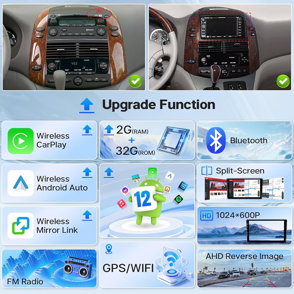 Wireless Apple Carplay & Android Auto - For 2008 Toyota Sienna Upgrade Replacement compatible with wireless apple carplay and android auto, connect to mobile phone, access mobile phone address book, mail, notification, map navigation, music, video and other information, and realize voice control. Support IOS/Android mirror link function, you can mirror the phone interface to access all the functions on your phone through the big screen, like Youtube, Instagram, Snapchat, etc, more convenient!