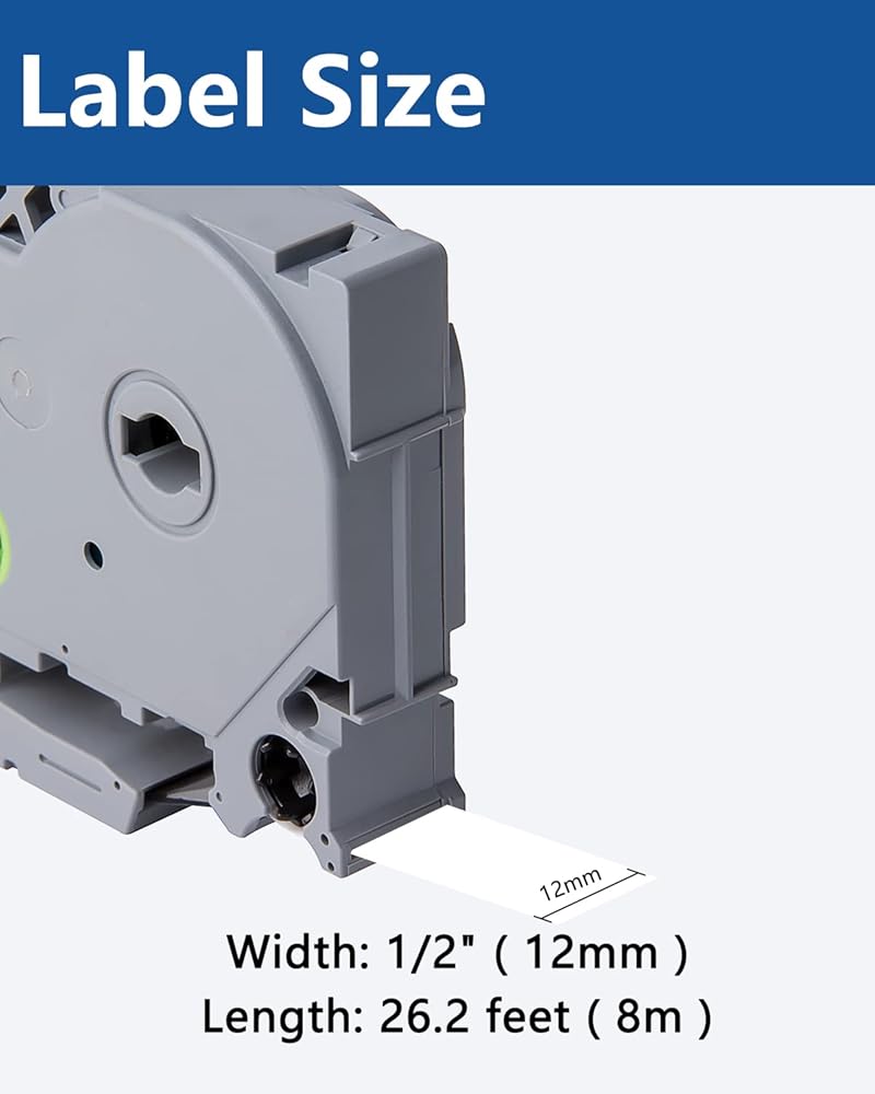 Size - 1/2" width x 26.2' length ( 12mm x 8m ) each 12mm label maker tape. Color - Black ink on white tape