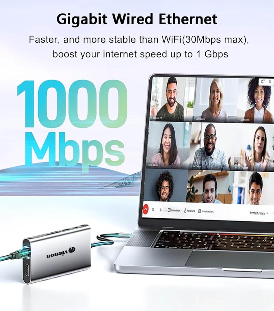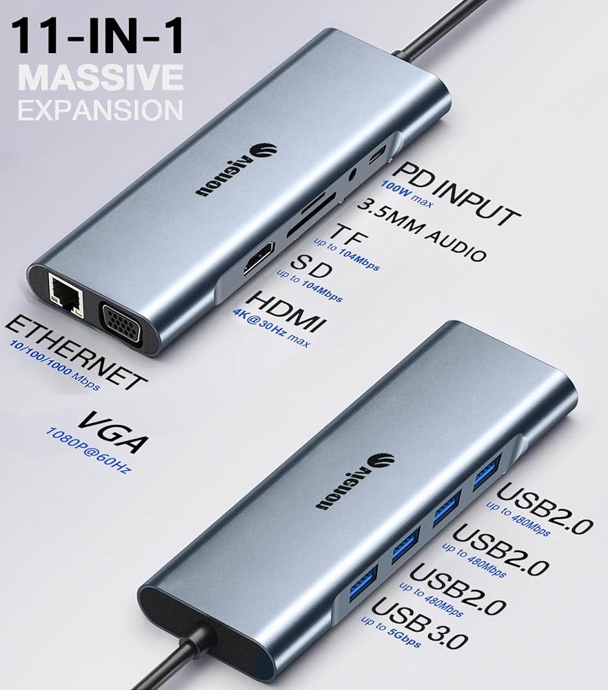 11-in-1 USB C Hub, Laptop Docking Station with RJ45 Gigabit Ethernet, 4K HDMI, 1080P VGA, SD/Micro SD Card Reader, 3.5 mm Audio Aux Jack, PD 100W Charging, Full Functional USB C Dongle