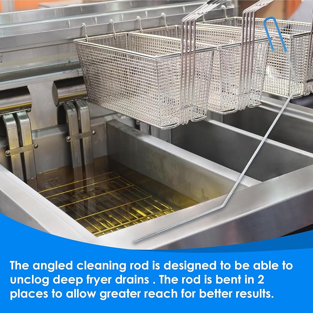 Fryer Cleanout Cleaning Rod: It's about 24.4 inches/62 cm long. The deep fryer cleaning rod can be stretched into between the tubes in the fryer to remove sediment or oil residue. The best tool to clean the clogged fryer drain. It holds up well against the heat and is also rustproof.