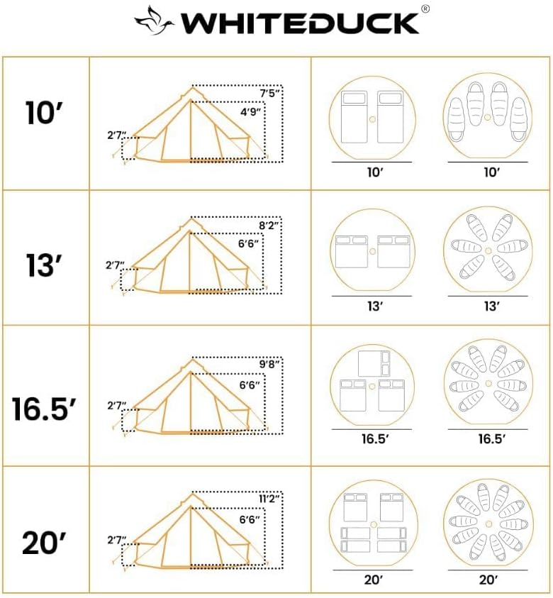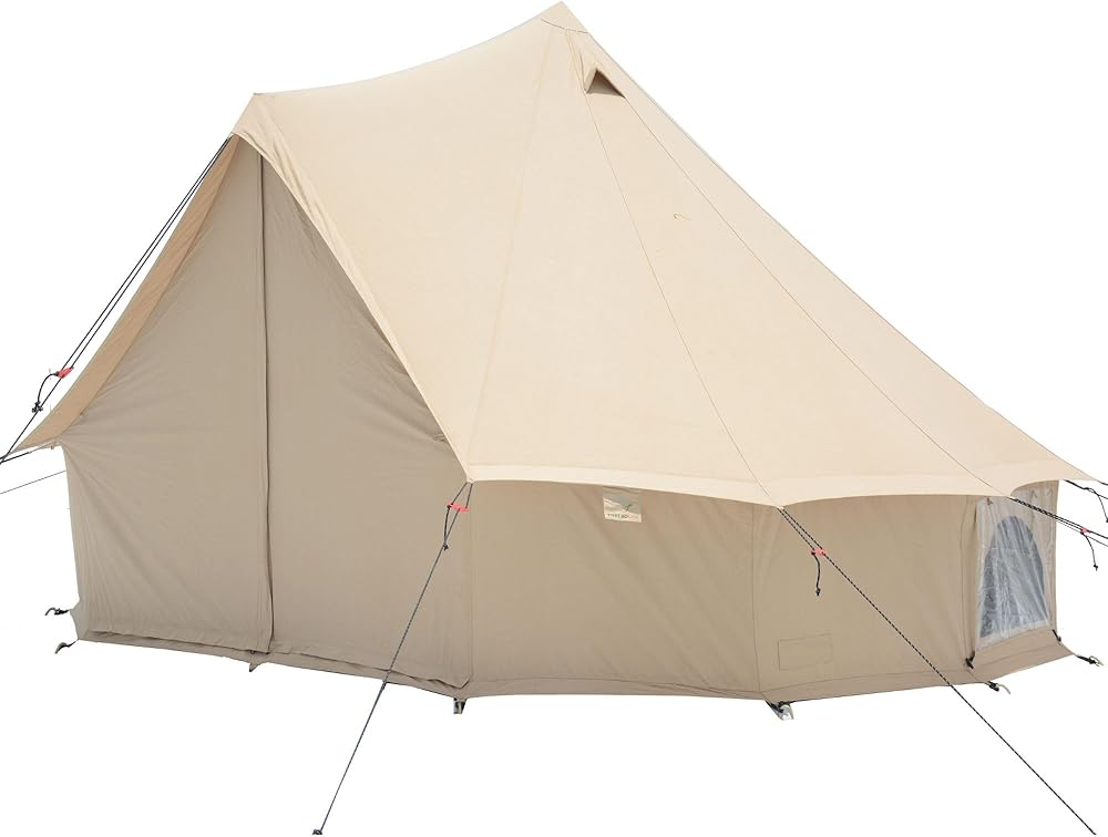 【EXTREMELY SPACIOUS GLAMPING TENT】 This yurt style glamping tent has a spacious design with standard wall height of 2'7" which is higher than average bell tent wall heights. The super spacious interior boasts tons of stand-up space and walk-around comfort. The Regatta comes in 4 sizes, perfect for your group of any size.