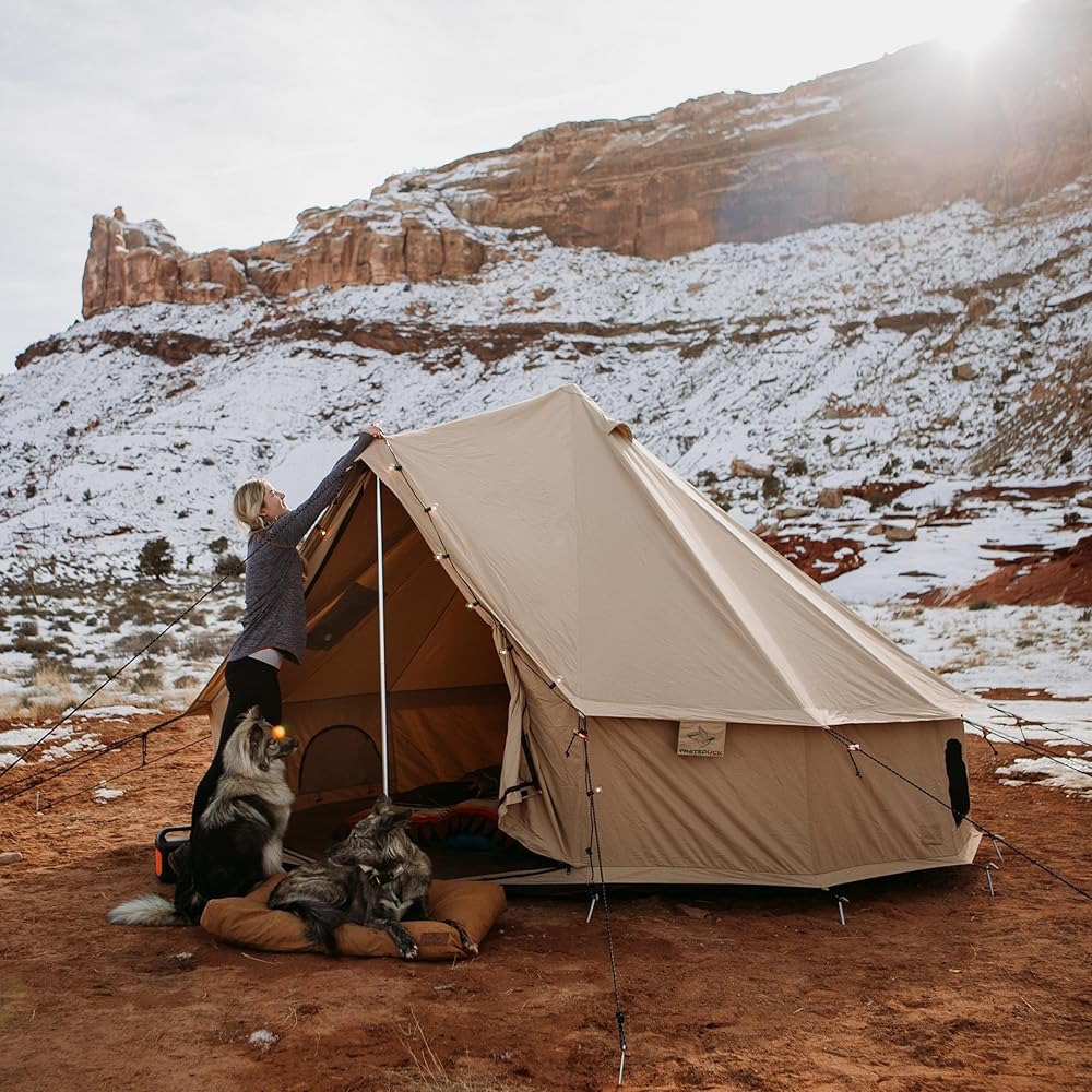 【BREATHABLE FABRIC and WIND ENDURANCE】 The Regatta canvas tent is made from breathable performance canvas. It's waterproof, UV resistant and available in multiple colors. With excellent wind and rain resistance, it's your reliable shelter in any weather. It's also available in a flame-retardant version for 4-season camping with wood stove. Elevate your outdoor experience with the White Duck Outdoors Regatta Tent.