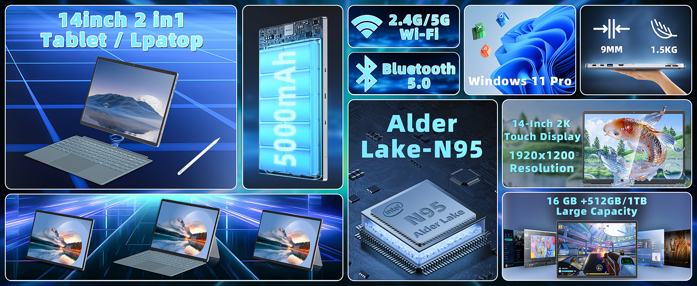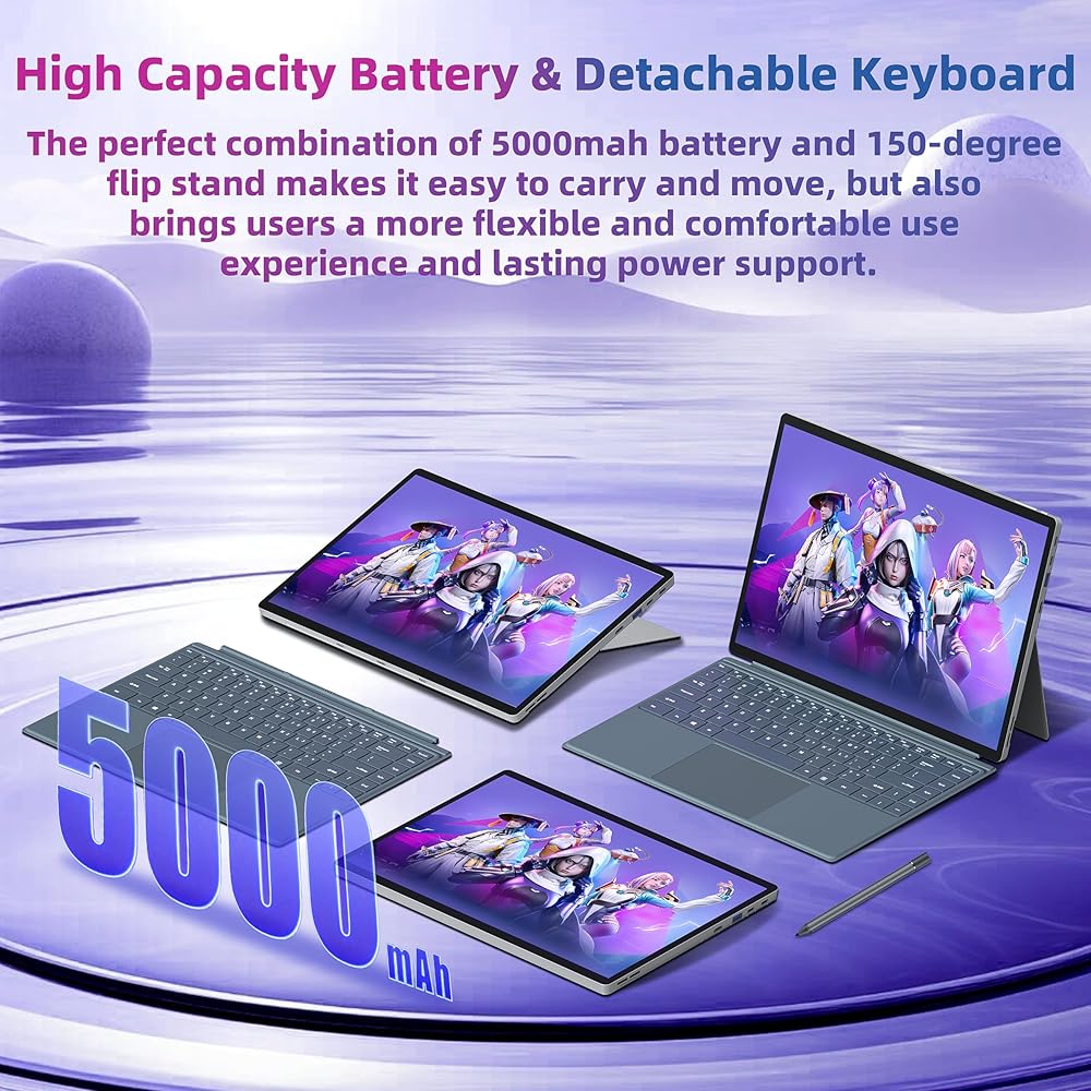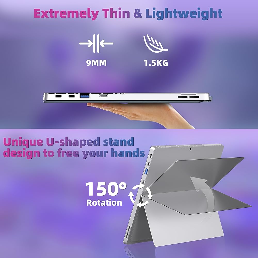 【Thin and light design】9mm ultra-thin design, weight is only 1.5KG.Rear-mounted flip-up metal stand adjustable from 0° to 150°,allowing you to seamlessly transform your 14'' tablet into a notebook,makes it easy for you to share content or collaborate with friends.This 2-in-1 laptop is easy to carry on both business commutes and mobile offices, and is rugged and high value.