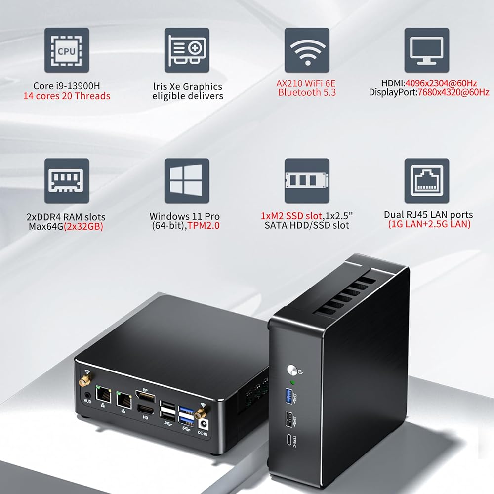 [High Performance] Mini PC equipped with Core i9-13900H processor, 14 cores 20 threads, 24M smart Cache, Max Turbo Frequency: 5.4GHz. This mini-computer is Pre-installed with Windows 11 Pro (64bit) OS, Built-in WiFi6E(802.11ax), Bluetooth 5.3, Compared to wifi6, the 6GHz band has been added for better anti-interference capability and faster transmission rate. Mini PC is ideal for such as Home Entertainment, AI, Design, Office, Online Education, Industry, etc.