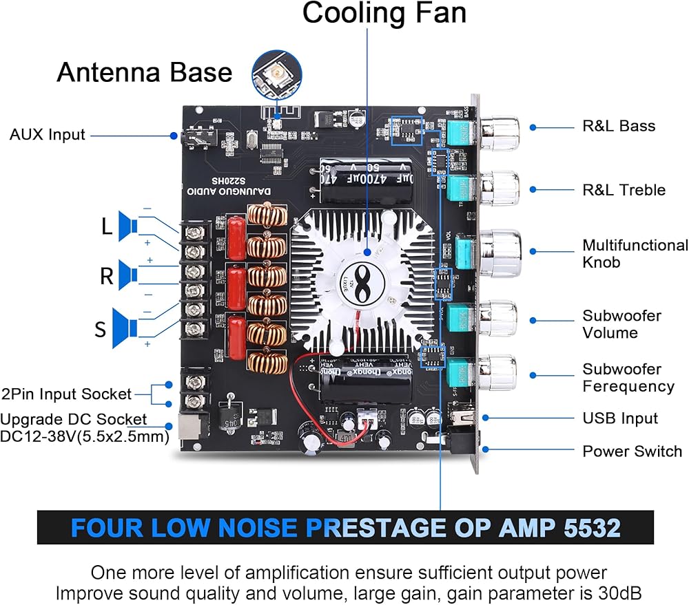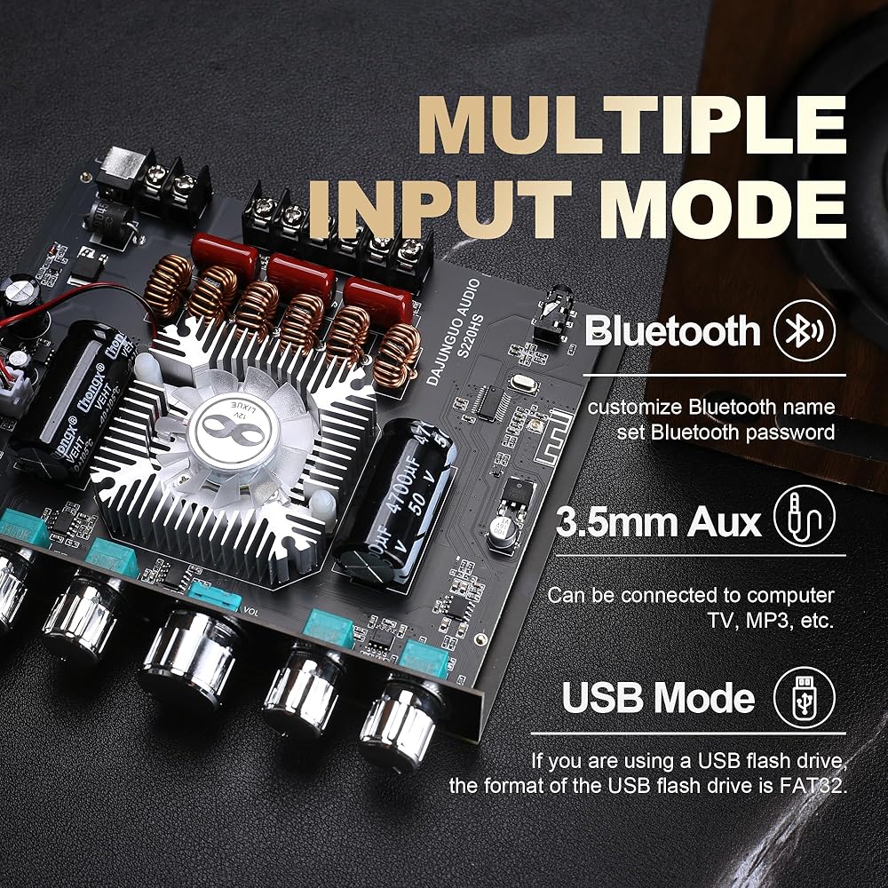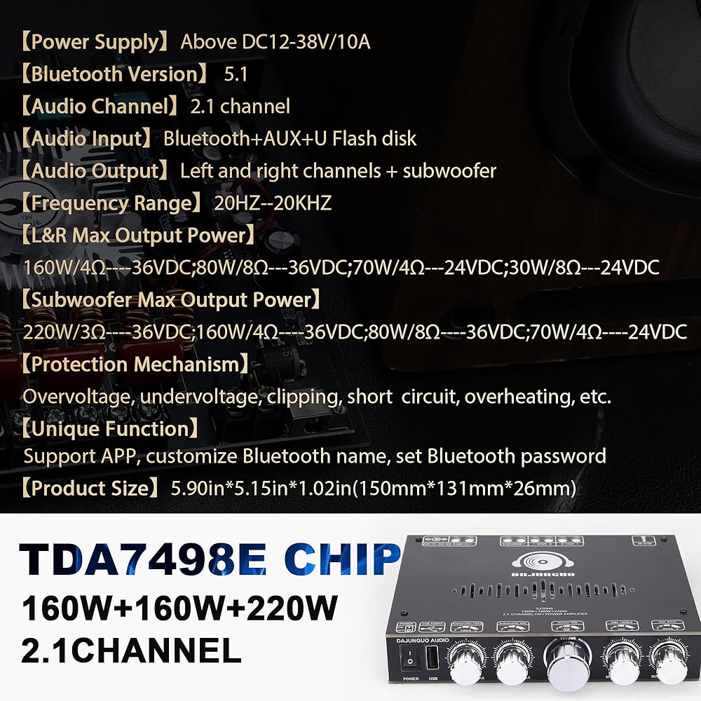 S220HS 2.1 Channel Bluetooth Power Amplifier Board, TDA7498E Chip 160W×2+220W, 12V-38V Audio Power Amplifier Module, Support Custom Bluetooth Name and Set Bluetooth Password