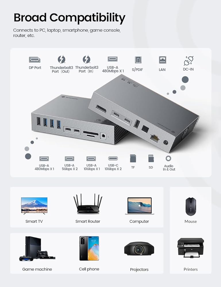 【11 in 1 40Gbps USB C Dock】This 40Gbps USB C Hub with dual-bay NVMe+SATA enclosure is compatible with Thunderbolt 3, and packed with features by integrating 10 multifunctional ports, including 2x Thunderbolt 3 40Gbps ports, 1x USB-C 10Gbps port, 1x USB-A 10Gbps port, 2x USB-A 5Gbps ports, 1x DisplayPort, 2x M.2 SSD slots, 3.5mm combo audio jack, and a Gigabit Ethernet port.