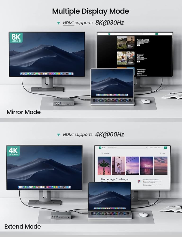 【Ultra HD Single 8K@30Hz & Dual 4K@60Hz Display】This usb c hub with M.2 SSD enclosure supports dual displays and can extend to dual 4K@60Hz displays via the Thunderbolt 3 port (OUT) and DisplayPort1.4. It can also support an expandable single display with resolutions of 8K@30Hz (7680x4320) or 5K@60Hz (5120x2880) through the Thunderbolt 3 port (OUT) or DisplayPort. (NOTE: MacBooks with M1 chips can only extend to a single monitor due to chip limitations.)