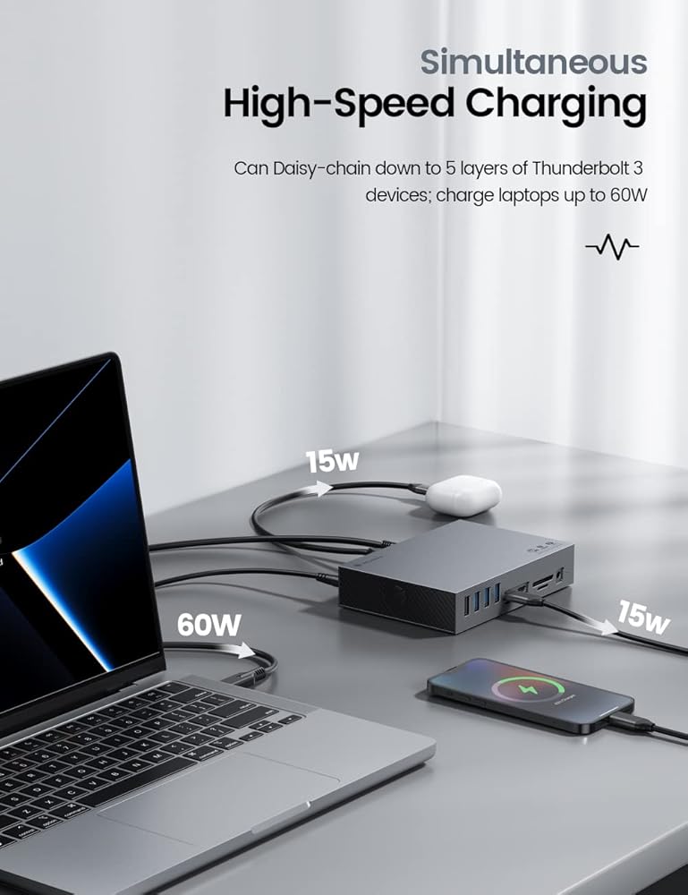 【Daisy Chain Extension & 120W Power Adapter】The 40Gbps port (input) connects Thunderbolt 3-enabled computers/laptops, while the Thunderbolt 3 port (output) with Daisy chain function can connect up to six other Thunderbolt 3 devices. The 120W power adapter provides up to 60W of power for laptop charging via PD3.0, as well as powering all other USB devices. The Thunderbolt 3 output port can deliver 15W to downstream devices.