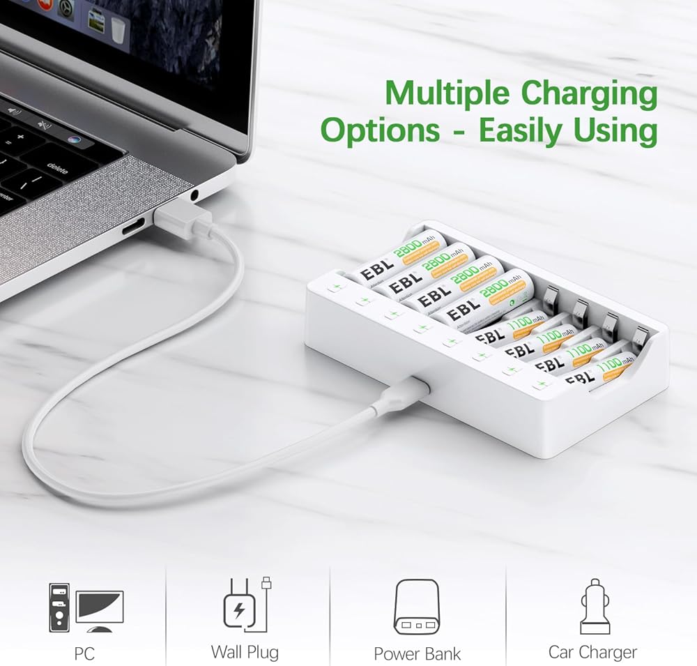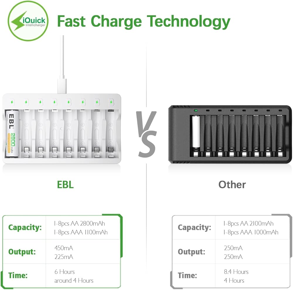 Long Battery Life: AAA rechargeable batteries up to 1200 charge cycles, EBL unique ProCyco (Professional recycle) tech helps maximizing battery lifespan and performance while charging.