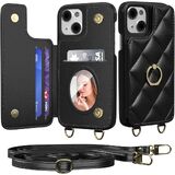 Crossbody Wallet with Cosmetic Mirror Case for iPhone 13, UP Leather Case with Card Slots Invisible Stand, Women Detachable Lanyard 6.1-Inch Phone Case Black