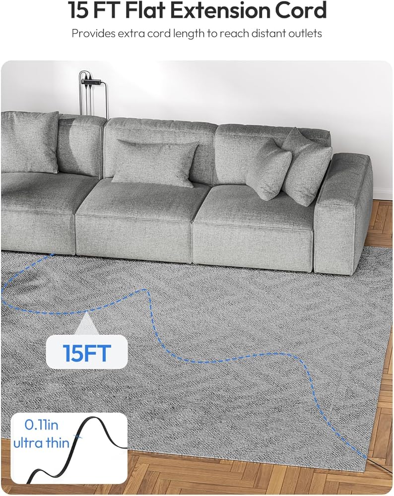 【Flat Extension Cord &Wall Mount】:5ft purple extension cord is more flexible. while the 0.11-inch ultra-thin flat extension cord is flatter and more flexible than traditional round extensions. can be hidden under the carpet. The wall mount power strip back has two mounting holes (includes 2 screws and mounting template). this slim power strip can be installed in narrow applications, saving you space, such as behind a bed, behind the sofa, bookcases, and under workbenches...