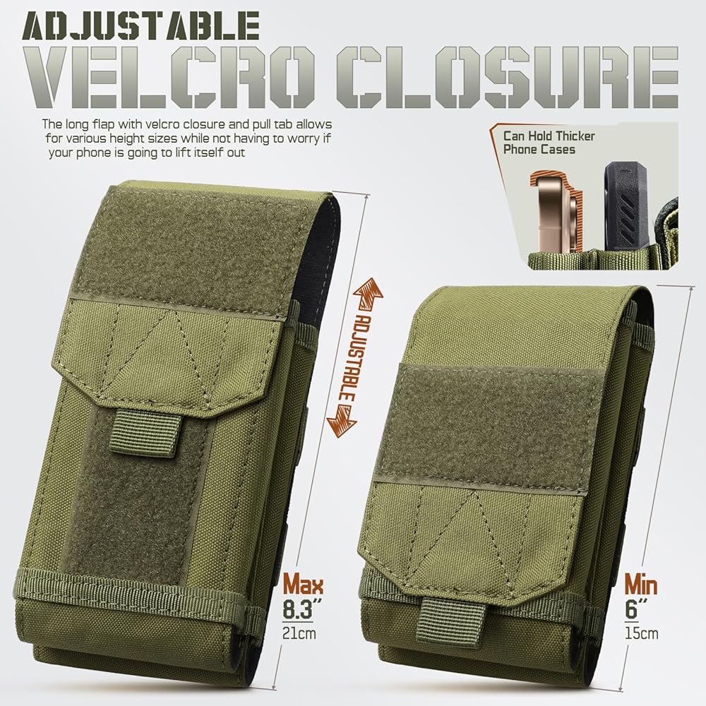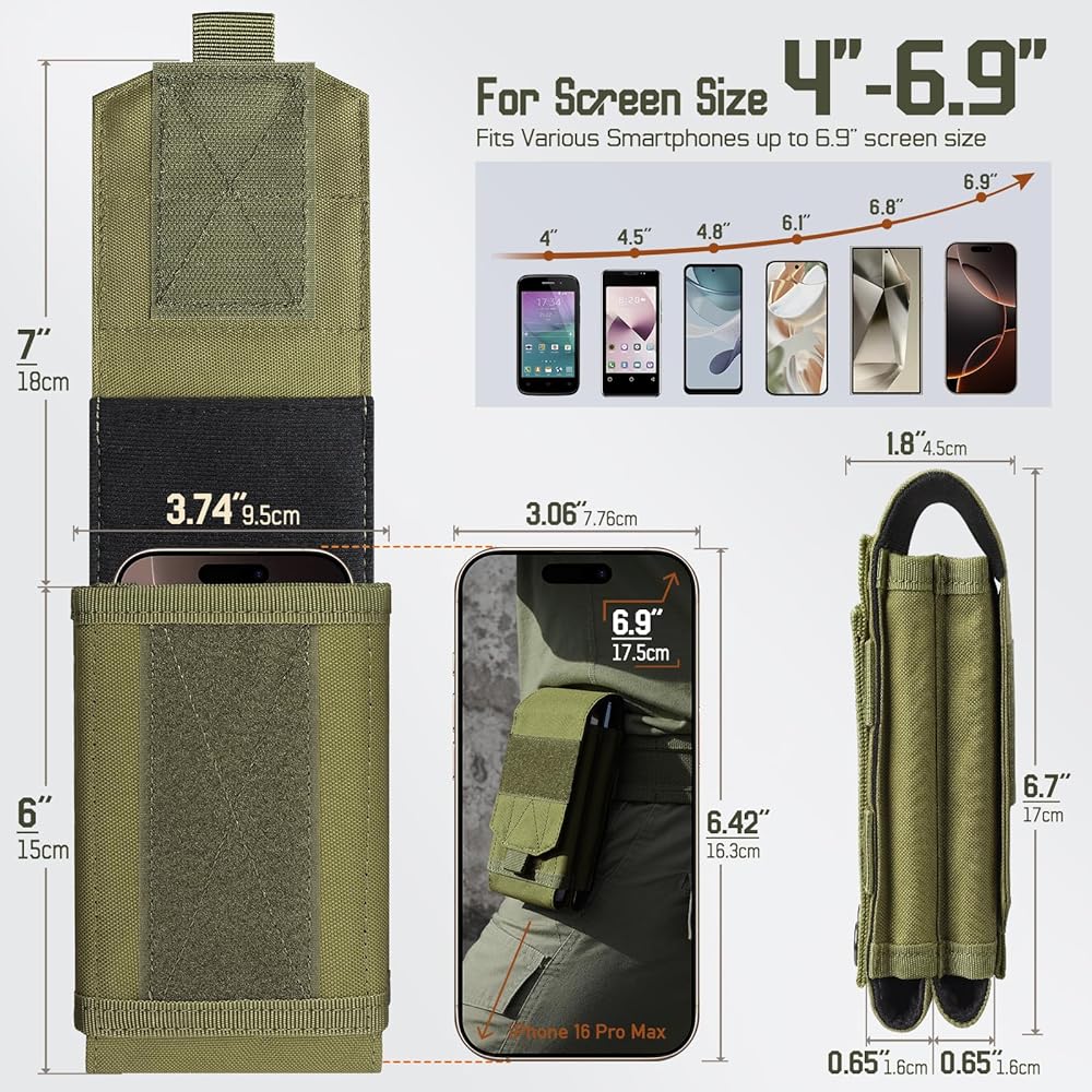 Universal Fit: Phone Pouch size: 3.74"L x 1.8"Wx 6.7"H(9.5 x 4.5 x 6.7cm), adjustable height: 6-8.3"(15-21cm). Tactical Phone Holster is spacious for 4"-6.9" cell phone, like iPhone 15 Pro Max / Galaxy S10/A53 / Note 10+ / Moto G Power / Pixel6, etc.